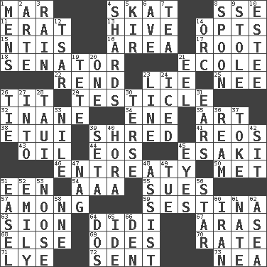 ACROSS 1. Third mo. 4. Three-handed card game 8. Compass dir. 11. Part of Q.E.F. 13. Hub of activity 14. Chooses 15. Nuclear Threat Initiatives 16. Length times width 17. Carrot, for example 18. Elected representative 21. Learning spot: Fr. 22. Tear apart 23. Untruth 25. Born 26. Teat (slang) 29. One of the two male reproductive glands 32. Silly 34. Compass dir. 35. Tate display 38. Needle holder 39. Fragment 41. Vintage cars 43. Lubricate 44. Greek goddess of the dawn 45. 1973 Nobel Price Winner (Physics) Leo 46. Plea 50. Was introduced to 51. Car or cant ending 54. American Automobile Association (abbr.) 55. Institutes legal proceedings 57. Amid 59. French poetic form 63. The Jewish people; Israel 64. "You Light Up My Life" star Conn 67. Caspian sea tributary 68. Otherwise 69. Lyric poems 70. Pace 71. Sodium hydroxide 72. Transmitted 73. Teachers' org. DOWN 1. Not women's 2. Johnson of "Laugh-In" 3. Water falling in drops from the sky 4. Broken pieces 5. Apertif with cassis 6. "___ Maria" 7. Beverage made from leaves 8. Soup utensil 9. Took without asking 10. First name in cosmetics 12. Russian ruler of old 14. The grampus (Milton) 19. Wig 20. Single 21. Snakelike fish 23. Actor's bit 24. On the rocks 26. Neckwear 27. To the inside or interior of 28. "Change" in Tahitian 30. Laconic 31. Hearing organs 33. "Death on the ____" 36. 480, 500 or 516 sheets of paper 37. Casino tip 39. Stalk of a moss capsule 40. Israeli folk dance 42. Be seated 45. Snake ____ (dice throw) 47. Tired old horse 48. Aid 49. Third day of the wk. 51. Artist's stand 52. Poet Dickinson 53. Trap for birds or small mammals 56. Play the lead 58. Compass dir. 60. SW Asia republic 61. Nathan's nickname 62. At sea 64. Two (Sp.) 65. Binary compound 66. Lair