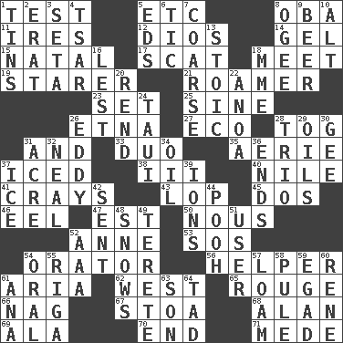 ACROSS 1. Trial 5. And so on (abbr.) 8. Chief or king in Benin or Nigeria 11. Angers 12. "Vaya con ____" 14. Set 15. Relating to or accompanying birth 17. Scram! 18. Confront 19. A viewer who gazes fixedly 21. Wanderer 23. Put into a specified state 25. Trig term 26. Inactive volcano in Sicily 27. Environmental prefix 28. Coat; cloak 31. Added to 33. Superhero pair 35. Nest on high 37. On the rocks 38. One more than two 40. The longest river in the world 41. Trading vessels 43. Chop off 45. Two (Sp.) 46. Snakelike fish 47. Eastern Standard Time (abbr.) 50. Common sense 52. Queen of England 1702-14 53. Mayday 54. Speaker 56. Aide 61. Operatic vocal solo 62. Compass direction 65. Makeup applied to the cheeks 66. Tired old horse 67. Portico 68. ____ Jay Lerner 69. According to 70. Conclusion 71. Ancient Persian DOWN 1. Canisters 2. Part of Q.E.F. 3. Bristle 4. Russian ruler of old 5. Begley and Asner 6. Nervous spasm 7. Rough 8. Double curve, resembling the letter S 9. Fermented drink made from hops 10. Keyboard modifier key 13. Unemotional 16. For fear that 18. Madame (abbr.) 20. Tear apart 22. Small Philippine buffalo 24. "Change" in Tahitian 26. Whirlpool 28. Musical group of three 29. Petroleums 30. Turn to the right 31. 1/640 square mile 32. Anneal 34. Lubricate 36. Conclusions 37. Frozen water 39. Charged particles 42. Posted 44. "Silly old bear" 48. Frozen precipitation (plural) 49. Cigar-shaped 51. One who uses or employs something 52. American Automobile Association (abbr.) 54. Relating to the mouth 55. Port city in Latvia 57. Rich soil 58. Whine 59. Mild oath 60. French philosopher Descartes 61. Santa ___, CA 63. Male offspring 64. Small amount or degree
