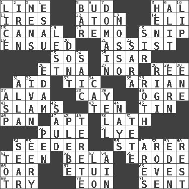 ACROSS 1. Welles in "The Third Man" 5. Partially opened flower 8. Actor Linden 11. Angers 12. Tiny particle 14. Connecticut Ivy Leaguer 15. Lessep's creation 17. San ____ (Riviera town) 18. Clip 19. Took place subsequently 21. Help 23. Mayday 25. Austrian river, tributary to the Danube 26. Inactive volcano in Sicily 27. Or not 28. To sift 31. Help 33. Nervous spasm 35. Believer in; advocate of (suffix) 37. Inventor's middle name 38. Island 40. Legendary monster 41. Hits or strikes with great force 43. Nine, plus one 45. Metal container 46. Baking dish 47. Fitting 50. Thin strip of wood or metal 52. Whimper 53. Sodium hydroxide 54. Sowing specialist 56. A viewer who gazes fixedly 61. Adolescent 62. Actor Lugosi 65. Eat (away) 66. Boat paddle 67. Needle case 68. Nights before holidays 69. Attempt 70. Age 71. Posted DOWN 1. Louse (plural) 2. SW Asia republic 3. Not women's 4. Son of Isaac 5. Long, evenly shaped piece 6. Shoshoni 7. Realm 8. Coop moms 9. Came down and settled, as after flight 10. Mouth edge 13. With motion or animation 16. For fear that 18. Title for a knight 20. Do not 22. "Two Mules for Sister ____" 24. Ketch in the Levant 26. Dutch treat 28. Swiss mountan, "Queen of the Mountains" 29. Merit 30. Compass dir. 31. Silent film actress Nazimova 32. "Terrible" tsar 34. Feline 36. Writer of Portnoy's Complaint (1969) 37. Cleo's killer 39. Shout 42. Saudi Arabian king (1953-1964) 44. Negative votes 48. Military trainee 49. Cigar-shaped 51. False hair 52. Writing instrument 54. Wither 55. Suggestive of the supernatural 57. Ancient Greek god of war 58. Be footloose 59. Genesis locale 60. Respite 61. Small child 63. Nilotic language 64. The 18th letter of the Arabic alphabet