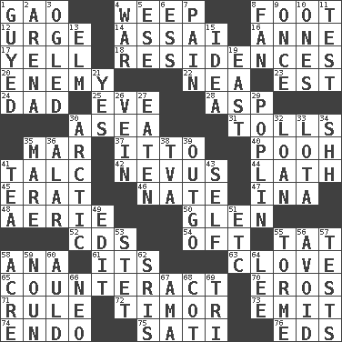 ACROSS 1. E Mali city 4. Shed a tear 8. Pick up the tab 12. Goad 14. Slender Brazilian palm 16. Singer Murray 17. Shout 18. Homes 20. Foe 22. Teachers' org. 23. Eastern Standard Time (abbr.) 24. Male parent 25. Night before a holiday 28. Cleo's killer 30. At sea 31. For Whom the Bell _____ 35. Spoil 37. "Tell ____ the Marines!" 40. "Silly old bear" 41. Baby powder 42. Mole, birthmark 44. Thin strip of wood or metal 45. Part of Q.E.F. 46. Nathan's nickname 47. _ tizzy (2 wds.) 48. Nest on high 50. Small, secluded valley 52. Music discs 54. Often (poetically) 55. Make lace 58. Santa ___, CA 61. ___ a Wonderful Life 63. Garlic unit 65. Act in opposition 70. Greek god of love 71. General guideline 72. Southeast Indonesia island 73. Send forth 74. Inside; within (prefix) 75. Suttee (variant) 76. Begley and Asner DOWN 1. Ridiculed 2. Sports stadium 3. Stared at amorously 4. Armed conflict 5. Compass dir. 6. Double-curved letter 7. Ache 8. Air blower 9. Single time 10. Singles 11. Trial 13. Shade tree 15. The content of cognition 19. Compass direction 21. Consenting reply 26. Distinctive style or manner 27. Consumed 29. Cotton for raincoats, e.g. 30. Northern region 32. Grant temporary use of 33. Globular water bottle used in Asia 34. Quiet! 35. Female horse 36. Having or resembling wings 38. Federal power corp. 39. Money paid out 41. Beverage made from leaves 43. Automatic 49. Prepare for publication 51. And so on (abbr.) 53. Proofreading order 55. Singer Mel 56. Prevent from happening 57. Trials 58. Measure of real estate 59. Part of speech 60. Old (Scot.) 62. Indian titles of respect 64. Area sheltered from the wind 66. Modern: prefix 67. Nursemaid (var.) 68. Small bed 69. Three (prefix)