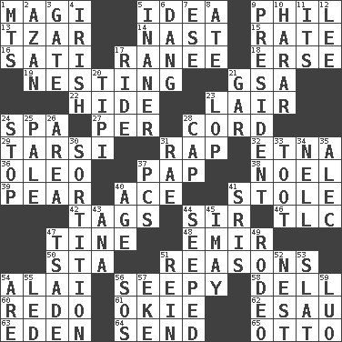 ACROSS 1. Wise men 5. The main thing one is thinking about 9. Silvers or Donahue 13. Czar 14. Political cartoonist Thomas 15. Assign a rank or rating to 16. Suttee (variant) 17. The wife of a rajah (variant) 18. Celtic language 19. Inhabiting a nest 21. Girls' org. (abbr.) 22. Flintstone garb 23. Den 24. Health resort 27. For each 28. Drawstring 29. Tarsus (plural) 31. Strike 32. Inactive volcano in Sicily 36. Butter sub 37. Infant food 38. Christmas carol 39. Lightbulb-shaped fruit 40. Adept person 41. Fur scarf 42. Labels 44. Title for a knight 46. Affectionate concern, for short 47. Prong on a fork 48. Arab leader 50. R.R. building 51. Thinks logically 54. Jai _ 56. Oozy 58. Small valley 60. Do over again 61. Migrant worker of the '30s 62. Son of Isaac 63. Locale of original sin 64. Post 65. Von Bismarck DOWN 1. Mountains (abbr.) 2. Muslim summons to prayer 3. Yard entry 4. From or relating to Ireland 5. More empty; more void 6. Mild oath, euphamism for damn 7. Compass dir. 8. Had dinner 9. Elected leader of a country 10. Ethiopian city, capital of Harari 11. ___ a Wonderful Life 12. Area sheltered from the wind 17. Travel on or in a vehicle 20. Native american tent (variation) 21. Slender fish 23. Trim (branches) 24. Halt 25. Light colored 26. Length times width 28. Head covering 30. Conclusion 31. Actress Charlotte 33. A blast of a horn 34. 1994 drama film starring Jodie Foster 35. Actor Baldwin 37. Personal Computers (abbr.) 40. Ripen 41. Indian titles of respect 43. Santa ___, CA 44. Oozed 45. "If ____ say so..." 47. Sadhe (variant) 49. Cowboy competition 51. It's straight from the horse's mouth 52. Egg locale 53. Narrow board 54. "We ___ not amused" (Victoria) 55. Directed 56. Mayday 57. Supplement with great effort 59. Nilotic language