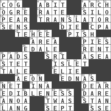 ACROSS 1. Gear tooth 4. "This won't hurt ____!" 8. Bowlike part 12. Legendary monster 14. Pace 15. Grain storage tower 16. Lightbulb-shaped fruit 17. Interpreter 20. Elected reps. 21. Expire 22. Accounting whiz (abbr.) 23. Giggle 27. Expression of disdain 29. Type of rug 31. Sliced desserts 34. Peak District village in England 35. Monthly bill 36. Writing tablets 39. Indian title of respect (Mr.) 41. Toward the sea 42. Proofreading order 43. Small island 46. Lie 47. Writer Wiesel 48. A really long time 51. Ferber et al. 54. Fish or hair follower 56. _ tizzy (2 wds.) 58. Letter starter 61. The property of being fit to eat 66. Have the gumption 67. Small Philippine buffalo 68. It was, poetically 69. Comedian Laurel of Laurel & Hardy 70. Long (Scottish) 71. Back-to-school mo. 72. Compass dir. DOWN 1. 911 reaches them 2. Double curve, resembling the letter S 3. Monetary aid 4. Tate display 5. Long, evenly shaped piece 6. Call ___ day 7. Watch over 8. White ___ sheet 9. Actors Guy, Robert Welles, and Clint 10. Hoof sound 11. Israeli folk dance 13. Celtic language 18. Small drink 19. Luau accessory 24. Possessed 25. Epoch 26. Snakelike fish 28. Small fatty European fish 30. Nest on high 32. Compass dir. 33. R.R. building 34. First name in cosmetics 36. Pacific Standard Time (abbr.) 37. "One Day ___ Time" 38. Accusation by an informer 40. Small island 44. Flaplike covering 45. Car or cant ending 49. Lubricate 50. Compass dir. 52. Does sums 53. Theater features 54. Actress Patricia 55. Pulitzer Prize-winning author Ferber 57. Pismires 59. Caspian sea tributary 60. French philosopher Descartes 62. Paper or plastic container 63. She-sheep 64. Plant excrement 65. Fast jet (abbr.)