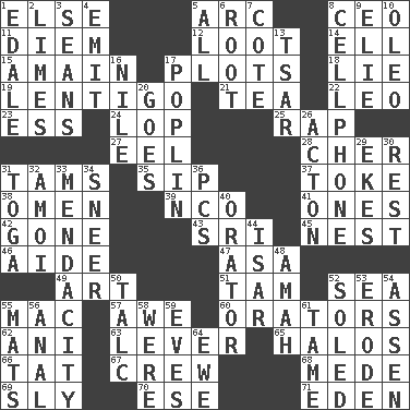ACROSS 1. Otherwise 5. Curve 8. Corporate head (abbr.) 11. South Vietnam president (1954) 12. Spoils 14. Pipe bend 15. At full speed 17. Graphs 18. Whopper 19. Small, flat, pigmented spot on the skin 21. Beverage made from leaves 22. Lion 23. Double-curved letter 24. Chop off 25. Strike 27. Snakelike fish 28. "Mermaids" star 31. Scottish caps 35. Small drink 37. Puff or smoke 38. Sign of something about to happen 39. Non-commissioned officer (abbr.) 41. Singles 42. Went 43. Indian title of respect (Mr.) 45. A home for chicks 46. Assistant 47. White ___ sheet 49. Tate display 51. Scottish cap 52. Ocean 55. Apple computer (short form) 57. Deep reverence 60. Speakers 62. Black tropical American cuckoo 63. Crowbar 65. Rings 66. Make lace 67. Group working together 68. Ancient Persian 69. Playfully artful 70. Compass dir. 71. Genesis locale DOWN 1. Peak District village in England 2. Citrus fruits 3. Seines 4. Send forth 5. Everything 6. Carrot, for example 7. ____ d'Azur (French Riviera) 8. Portable communications device 9. Writer Wiesel 10. Butter sub 13. Russian ruler of old 16. "Death on the ____" 17. Cotton for raincoats, e.g. 20. Leaves 26. NE Massachussets city 29. Supplements with great effort 30. Take ten 31. Ancient Roman robe 32. Mine, in Marseilles 33. Ananias' fault 34. Contemptuous expression 36. Personal Computers (abbr.) 40. Speaker 44. Austrian river, tributary to the Danube 48. Wet nurse 50. Baby powder 52. Having a sole or soles 53. Wear away 54. NE Netherlands city 55. Floor protectors 56. Of or related to the anus 58. We are 59. Nights before holidays 61. Docile 64. She-sheep