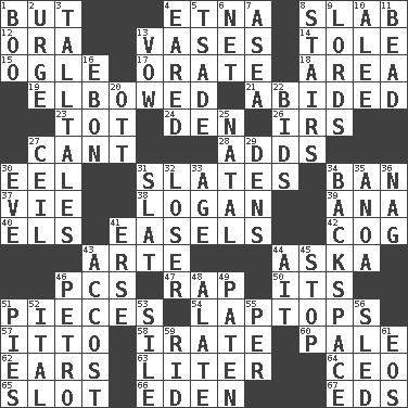 ACROSS 1. On the contrary 4. Inactive volcano in Sicily 8. Broad, flat, thick piece 12. Mouth or opening 13. Flower holders 14. Lacquered or enameled metalware 15. Stare at amorously 17. Speak pompously 18. Length times width 19. Shoved, as through a crowd 21. Remained 23. Small child 24. Lair 26. Big collection agency 27. Patter 28. Sums up 30. Snakelike fish 31. Chalkboards 34. Forbid 37. Compete 38. Utah city north of Ogden 39. Santa ___, CA 40. Raised railways 41. Artist's stands 42. Gear tooth 43. Johnson of "Laugh-In" 44. "____ silly question..." 46. Personal Computers (abbr.) 47. Strike 50. It is 51. Parts 54. Portable computers 57. "Tell ____ the Marines!" 58. Feeling or showing extreme anger 60. Light colored 62. Hearing organs 63. 61 cubic inches 64. Corporate head (abbr.) 65. Narrow, elongated depression 66. Locale of original sin 67. Begley and Asner DOWN 1. Sometimes accompanies a hiss 2. Goad 3. Baron Munchausen's specialties 4. Having ears or earlike features 5. Sadhe (variant) 6. Fish or hair follower 7. Toward the sea 8. Flight of steps 9. Domineers 10. Toward shelter 11. Necklace unit 13. Solemn pledge 16. Inky black, to poets 20. Baseball player Mel 22. Auction offers 25. Relating to or accompanying birth 27. To provide with a ceiling 29. Lairs 30. Night before a holiday 31. Narrow board 32. Failure 33. Grow older 34. Keyboard key 35. Small Philippine buffalo 36. Tired old horse 41. Celtic language 43. Buttonhole 44. Small island 45. Obstruct or block passage 46. Stone: prefix 48. Having winglike extensions 49. Eucharist need 51. Sliced desserts 52. Slanted text style (abbr.) 53. Drop; flow; fall 55. For each 56. Downhill vehicle 59. To free from 61. Greek goddess of the dawn