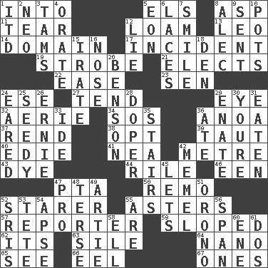 ACROSS 1. To the inside or interior of 5. Raised railways 8. Cleo's killer 11. Pull into pieces 12. Rich soil 13. Lion 14. Kingdom 17. Event 19. Disco prop 21. Chooses 22. Relaxation 23. Elected rep. 24. Compass dir. 27. Look after 29. Sight organ 32. Nest on high 34. Distress signal 36. Small Philippine buffalo 37. Tear apart 38. Choose 39. Strained 40. Singer Brickell 41. Teachers' org. 42. Distance measurement (Brit.) 43. Color 44. Cause heat under the collar 46. Car or cant ending 47. Parent Teacher Assoc. 50. San ____ (Riviera town) 52. A viewer who gazes fixedly 55. Michaelmas daisies 57. News announcer 59. Inclined 62. ___ a Wonderful Life 63. Filth; sediment 64. Billionth: prefix 65. Perceive with the eye 66. Snakelike fish 67. Singles DOWN 1. It would 2. Modern: prefix 3. Scottish caps 4. Declaim 5. A really long time 6. Shoestrings 7. Grin 8. Actor Baldwin 9. Posted 10. Plant holders 12. Untruth 15. Feeling or showing extreme anger 16. Sense of smell 18. Lair 20. Gillaume's butler role 24. Having ears or earlike features 25. Shabby and untidy 26. Bert's buddy 28. Drug addict 29. Maternal 30. You are 31. Consumed 33. Binary compound 35. Flight of steps 36. Had dinner 42. Klaipeda city 45. Allows 47. Adept person 48. Laconic 49. Nick name for Arthur 51. U. of Maine site 52. Indian titles of respect 53. Wig 54. Domed church section 55. "We ___ not amused" (Victoria) 56. Connect, as a bridge 58. Pipe bend 60. Compass dir. 61. Two (Sp.)