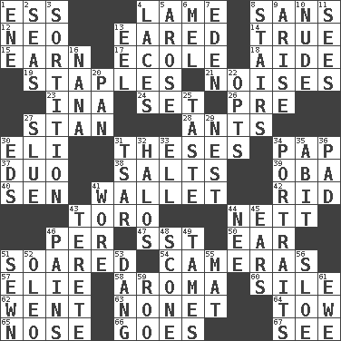 ACROSS 1. Double-curved letter 4. Unable to walk 8. Without 12. Modern: prefix 13. Having ears or earlike features 14. Loyal 15. Merit 17. Learning spot: Fr. 18. Helper 19. Paper fasteners 21. Annoying sounds 23. _ tizzy (2 wds.) 24. Put into a specified state 26. Before (prefix) 27. Comedian Laurel of Laurel & Hardy 28. Pismires 30. Biblical high priest 31. College papers 34. Infant food 37. Superhero pair 38. Table seasonings 39. Chief or king in Benin or Nigeria 40. Elected rep. 41. Place for singles 42. To free from 43. "Corrida" creature 44. Remaining after all deductions 46. For each 47. Fast jet (abbr.) 50. Ewer handle 51. Flew 54. Devices for capturing images 57. Writer Wiesel 58. Scent 60. Filth; sediment 62. Gone 63. Music written for nine 64. Pull behind 65. Characteristic smell of wine 66. Leaves 67. Perceive with the eye DOWN 1. Compass dir. 2. Oceans 3. Determination 4. Shoestrings 5. Came up 6. Cartoonist voice _ Blanc 7. Locale of original sin 8. Flight of steps 9. Originate 10. Unadorned 11. Observes 13. Snakelike fish 16. Nanny 20. Baking dish 22. Elects 25. Clothes sense 27. Change direction abruptly 29. Egg locale 30. Begley and Asner 31. Russian ruler of old 32. Auras 33. Pipe bend 34. Likenesses of persons 35. "This won't hurt ____!" 36. Groovy apt. 41. Had on 43. Cigar-shaped 44. Born 45. Hearing organs 46. Aches 48. Biscuitlike quick bread 49. Corrects by punishment or discipline 51. Stitched 52. Butter sub 53. Mild oath, euphamism for damn 55. Floor covering 56. _ gin 59. Friend of Pooh 61. She-sheep
