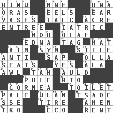 ACROSS 1. Tall New Zealand timber tree 5. Compass dir. 8. Heredity factor (abbr.) 11. Mouths or openings 12. Snakelike fish 14. Ewer handle 15. Flower holders 17. Baby powder 18. 1/640 square mile 19. Main course 21. Of or pertaining to medicine 23. Allow head to fall sleepily 25. Norwegian king 26. Pulitzer Prize-winning author Ferber 27. Label 28. Floor covering 31. Direct toward a target or goal 33. Symbol (abbr.) 35. Vertical member of a panel or frame 37. Against 38. Plant excrement 40. Water jar 41. Theater features 43. Affirmative reply 45. Chicken ___ king 46. Leather borer 47. Scottish cap 50. Old (Scot.) 52. Whine 53. River (Sp.) 54. Pupil covering 56. Bathroom 61. Light colored 62. ____ Bator, Mongolia 65. Sadhe (variant) 66. Compass dir. 67. Hoop that covers a wheel 68. So be it 69. Ring climax 70. Environmental prefix 71. Monthly bill DOWN 1. Be footloose 2. SW Asia republic 3. Vertical spar for supporting sails 4. One who uses or employs something 5. Fish or hair follower 6. Teachers' org. 7. American author Paul (1891-1958) 8. Tenth: prefix 9. Drug cop 10. "We ___ not amused" (Victoria) 13. Any of the three canals of the cochlea 16. Post 18. Sandy's bark 20. Immeasurably long periods of time 22. Labels 24. 24-hour periods 26. Send forth 28. Place where flour is made 29. Silent film actress Nazimova 30. Beverage made from leaves 31. Afresh 32. Slanted text style (abbr.) 34. Fifth month 36. Frog relative 37. White ___ sheet 39. Lightbulb-shaped fruit 42. Astound 44. Costume for a special activity 48. Native American of Southwest Alaska 49. Ear of corn 51. Plunder 52. Before (prefix) 54. Keg 55. Butter sub 57. Austrian river, tributary to the Danube 58. Unable to walk 59. Genesis locale 60. Portable shelter 61. Pacific Standard Time (abbr.) 63. Curve 64. Modern: prefix