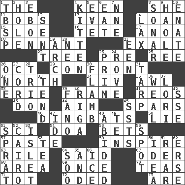 ACROSS 1. Definite Article 4. Peachy ____! 8. A female animal or person 11. Moves up and down 13. "Terrible" tsar 14. Grant temporary use of 15. _ gin 16. False hair 17. Small Philippine buffalo 18. Pre-World Series prize 21. Glorify 22. Woody plant 23. Before (prefix) 25. To sift 26. Sep. follower 29. Meet 32. Compass direction 34. 54 in ancient Rome 35. Leather borer 38. One of the Great Lakes 39. Movie unit 41. Vintage cars 43. Spanish title 44. Direct toward a target or goal 45. Practice fights 46. Empty-headed or silly people 50. Falsehood 51. _-fi 54. ___ good deed 55. Wagers 57. Thick mixture 59. Stimulate to action 63. Cause heat under the collar 64. Stated 67. Baltic tributary 68. Type of rug 69. Single time 70. Beverages made from leaves 71. Small child 72. Wrote a lyric poem 73. "We ___ not amused" (Victoria) DOWN 1. Cook's measure (abbr.) 2. Hollow 3. Inky black, to poets 4. Baby cat 5. Night before a holiday 6. Ingest 7. Compass dir. 8. Underwater navigation system 9. White Person, in Hawaii 10. Related on the mother's side 12. Transmitted 14. Not strict 19. Bowlike part 20. Modern: prefix 21. Car or cant ending 23. Demure 24. Be footloose 26. Single 27. Drawstring 28. Musical group of three 30. Flambe (short form) 31. Canvas cover 33. Be inclined (to) 36. Welt 37. Australian parrot (variant) 39. Papal veil 40. Port city in Latvia 42. Compass dir. 45. Fast planes 47. Binary compound 48. Stayed 49. Nine, plus one 51. Small fatty European fish 52. Capital of Egypt 53. Small island 56. Blemish 58. Afternoon social gathering 60. It may be bright or harebrained 61. Bring up, as a child 62. Celtic language 64. "Barney Miller" actor Jack 65. Plus 66. Frozen water