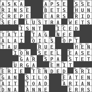 ACROSS 1. "____ silly question..." 5. Domed church section 9. Compass dir. 12. Wash lightly 14. Stakes 15. Attila the _ 16. Streamer paper 17. Hearing organs 18. To free from 19. Perceive with the eye 20. A period of five years 23. Soaks 24. Is not 25. On the rocks 27. Jacques of French films 30. Label 32. Born 33. Jai _ 34. Lubricates 36. Elect 38. The 19th letter of the Greek alphabet 39. Regret 40. Layer 43. Electrically charged atom 46. Sew up the eyelids of hawks and falcons 48. Relaxation 49. Slender fish 51. Health resort 52. Proofreading order 53. Capital and largest city of Mongolia 54. Give off 56. One of the Great Lakes 58. Looked after 61. _ Lanka 64. Separate the seeds from cotton 65. Grain storage tower 66. Consumed 68. Small island 69. Frog relative 70. Believer in; advocate of (suffix) 71. Heredity factor (abbr.) 72. Queen of England 1702-14 73. Blunders DOWN 1. Arches 2. The founder of a family 3. Leg joint 4. Viper 5. Collude with 6. Lightbulb-shaped fruit 7. Put through a sieve 8. Double-curved letter 9. Fragment 10. Set or collection 11. Conclusions 13. Snakelike fish 21. To (old English) 22. Flight of steps 23. Shed a tear 24. One more than two 26. Corporate head (abbr.) 27. Make lace 28. According to 29. "Change" in Tahitian 31. Cements 35. Oozed 37. Not this but _ 41. Compass dir. 42. Fish or hair follower 44. Legendary monster 45. Tired old horse 47. Unable to walk 48. Eastern Standard Time (abbr.) 50. Food allowance for one day 53. National forest in Provo, Utah 55. The main thing one is thinking about 56. Mild oath 57. Precipitation 59. Style 60. Connecting point 61. Tumult 62. Hitchcock's "____ Window" 63. Taverns 65. R.R. building 67. "We ___ not amused" (Victoria)