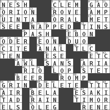 ACROSS 1. Delicate 5. Clement's nick name 9. E Mali city 12. Greek mythologigal hunter 14. Be footloose 15. Electrical Unit 16. National forest in Provo, Utah 17. Of the mouth 18. Was introduced to 19. Perceive with the eye 20. Slept 23. Canisters 24. Romantic infatuation 25. Inky black, to poets 27. River in Europe 30. Age 32. Superhero pair 33. Quote 34. Of or related to the anus 36. Affectionate concern, for short 38. Nine, plus one 39. Compass dir. 40. And so on (abbr.) 43. Leather borer 46. Without 48. Roberta Peters solo 49. River (Sp.) 51. Chop off 52. Proofreading order 53. Fermented drink made from hops 54. Play 56. Amused look 58. Erase 61. Teat (slang) 64. Wind 65. Actor Lugosi 66. 1973 Nobel Price Winner (Physics) Leo 68. Bit 69. Water falling in drops from the sky 70. The easternmost of the Lesser Sundas 71. Raised railways 72. Cassini of fashion 73. French philosopher Descartes DOWN 1. Good sense 2. One of the Great Lakes 3. Trig term 4. Being at a high temperature 5. Riding implement 6. Old wives' tales, e.g. 7. Dodged 8. Cartoonist voice _ Blanc 9. Homeless child 10. So be it 11. Chooses 13. Nanny 21. Toward the sea 22. Gives a jingle 23. Utensil 24. Before (prefix) 26. With the exception that 27. Sep. follower 28. Pass on 29. Inactive volcano in Sicily 31. Rhinal 35. Poe poem 37. Sure thing 41. Neckwear 42. Feline 44. Songbird 45. Falsehood 47. Specific locale 48. Viper 50. Severe or trying experience 53. Avian creatures 55. Rendezvous 56. Yard entry 57. Monetary unit of Yemen 59. Writer Wiesel 60. Long (Scottish) 61. Docile 62. Picture 63. Hoop that covers a wheel 65. Sis' sibling 67. Title for a knight