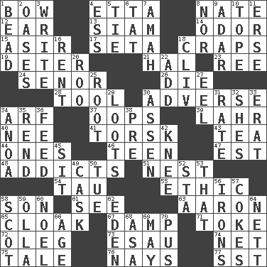 ACROSS 1. Ribbon knot 4. Singer James 8. Nathan's nickname 12. Ewer handle 13. Thailand, formerly 14. Aroma 15. SW Saudi Arabia district 17. Stalk of a moss capsule 18. Dice game 19. Prevent from occurring 21. Actor Linden 23. To riddle 24. Sir (Sp.) 26. Expire 28. Instrument 30. Contrary to your interests or welfare 34. Sandy's bark 37. I made a mistake 39. Cowardly lion portrayer 40. Born 41. Cod relative 43. Beverage made from leaves 44. Washington bills 46. Adolescent 47. Eastern Standard Time (abbr.) 48. Inveterate users 51. A home for chicks 54. The 19th letter of the Greek alphabet 55. Moral principle 58. Male offspring 61. Perceive with the eye 63. Composer Copland 65. Covering 67. Moist 71. Casino tip 72. Cassini of fashion 73. Son of Isaac 74. Fish or hair follower 75. Lie 76. Negative votes 77. Fast jet (abbr.) DOWN 1. Necklace unit 2. Fertile tracts in a desert 3. Compose 4. Curvy letter 5. Neckwear 6. Make lace 7. Housemaid 8. Not either 9. The sixth month of the Jewish calendar 10. Drink excessively 11. Celtic language 16. Monthly bill 18. 154 in Roman numerals 20. Friend of Pooh 22. Say or write further 25. Carrot, for example 27. Snakelike fish 29. Plunders 30. NE Netherlands city 31. Pace 32. "______ My Girl" (Turtles hit) 33. Part of Q.E.F. 34. Small Philippine buffalo 35. Tear apart 36. Nourish 38. Before (prefix) 42. Leg joint 45. Be seated 49. Keg 50. Third day of the wk. 52. R.R. building 53. Not this but _ 56. Removes the wrinkles 57. Popular sodas 58. Native of Scotland 59. Rounded earthenware pot or jar 60. Christmas carol 62. Paradise 64. Remaining after all deductions 66. Personal question 68. White ___ sheet 69. Can I? 70. Ichor