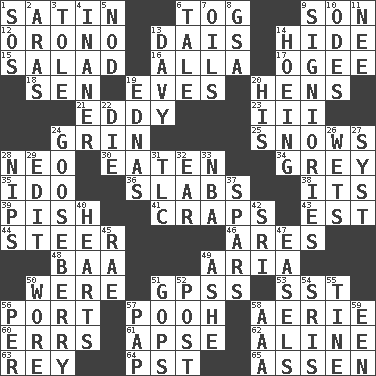 ACROSS 1. Smooth fabric 6. Coat; cloak 9. Male child 12. U. of Maine site 13. Raised platform 14. Flintstone garb 15. First course 16. Silent film actress Nazimova 17. Double curve, resembling the letter S 18. Elected rep. 19. Nights before holidays 20. Coop moms 21. Whirlpool 23. One more than two 24. Smile widely 25. Frozen precipitation (plural) 28. Modern: prefix 30. Eroded 34. Jennifer or Joel 35. Wedding promise 36. Thick slices 38. ___ a Wonderful Life 39. Expression of disdain 41. Dice game 43. Eastern Standard Time (abbr.) 44. Navigate 46. Ancient Greek god of war 48. Sound made by sheep 49. Operatic vocal solo 50. Past tense of be (plural) 51. Global Positioning Systems (abbr.) 53. Fast jet (abbr.) 56. Left side of a ship or aircraft 57. "Silly old bear" 58. Nest on high 60. Blunders 61. Domed church section 62. Place in a line 63. Marina Del _, California 64. Pacific Standard Time (abbr.) 65. NE Netherlands city DOWN 1. Distress signal 2. Ancient river in northeast Turkey 3. Lacquered or enameled metalware 4. More empty; more void 5. Lower and raise head in agreement 6. Falsehood 7. Petroleums 8. Girls' org. (abbr.) 9. Seigniories (variant) 10. Lyric poems 11. Born 13. _ Jones' Locker 14. Weeding 19. Ferber et al. 20. Part of HMS, perhaps 22. Pass on 24. Sour, prickly fruit 26. Soaks 27. System (abbr.) 28. Pinches, bites 29. Prepare for publication 31. Affectionate concern, for short 32. Ewer handle 33. Basketball assoc. 37. Practice fights 40. Centers 42. Indian title of respect (Mr.) 45. Actress Charlotte 47. Artist's stands 49. American tennis player Robert 50. Had on 51. Republicans 52. Mail 54. Indian titles of respect 55. Prong on a fork 56. For each 57. Infant food 58. American Automobile Association (abbr.) 59. Car or cant ending