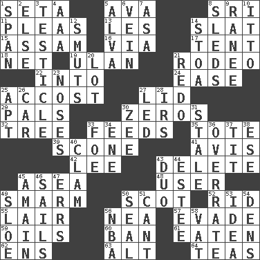 ACROSS 1. Stalk of a moss capsule 5. Actress Gardner 8. Indian title of respect (Mr.) 11. Entreaties 13. French article 14. Narrow board 15. Indian state 16. By way of 17. Portable shelter 18. Fish or hair follower 19. Uhlan (variant) 21. Cowboy competition 22. To the inside or interior of 24. Comfort 25. Buttonhole 27. Hat (slang) 29. Friends 30. Nothings 32. Family _ (genealogy) 33. Eats 35. Carryall 39. Biscuitlike quick bread 41. Opinion 42. Area sheltered from the wind 43. Keyboard key 45. Toward the sea 48. One who makes use of a thing 49. Excessive but superficial compliments 50. Highlander 52. To free from 55. Den 56. Teachers' org. 57. Elude 59. Lubricates 60. Bar 61. Ingested 62. Followers of ems 63. The first octave above the treble staff 64. Beverages made from leaves DOWN 1. Connect, as a bridge 2. Otherwise 3. A testis 4. American Automobile Association (abbr.) 5. Inventor's middle name 6. Distinctive style or manner 7. White ___ sheet 8. Bobsleighs 9. Indian princess (variant) 10. "Tell ____ the Marines!" 12. Particles of soot 14. Portico 20. Car dealer's back yard 21. Redecorate 23. Olfactory organs 25. Fitting 26. 4-wheeled motor vehicle 27. Directed 28. Big collection agency 30. Last letter of the English alphabet 31. Lacking originality or spontaneity 33. Enemy 34. Compass dir. 36. Make much ado about nothing 37. Teat (slang) 38. Compass dir. 40. Burrowing marine mollusk 43. Superhero pair 44. First name in cosmetics 45. With great haste 46. Travel by water 47. Blunders 49. _ gin 50. Lick closed 51. Patter 53. It may be bright or harebrained 54. Hiding places for outlaws 56. Basketball assoc. 58. Large container