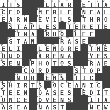 ACROSS 1. It is 4. One who doesn't tell the truth 8. Singer James 12. Corporate head (abbr.) 13. Haggard of country music 14. Be tempered by heat 15. Merit 17. Vices 18. Through, poetically 19. Paper fasteners 21. Cylindrical with tapered ends 23. _ tizzy (2 wds.) 24. 17th letter of the Greek alphabet 26. Area sheltered from the wind 27. Comedian Laurel of Laurel & Hardy 28. Raze (variant) 30. Biblical high priest 31. Poe poem 34. Definite Article 37. Superhero pair 38. Sports stadium 39. It is so 40. Elected rep. 41. Pictures 42. Actress Charlotte 43. Drawstring 44. Obstruct or block passage 46. Not either 47. Followers of ems 50. Nervous spasm 51. Chest coverings 54. Pertaining to the sea 57. Adolescent 58. Fertile tracts in a desert 60. Prepare for publication 62. Single time 63. Baking chambers 64. Call ___ day 65. Toward the sea 66. Political cartoonist Thomas 67. ___ Haven, CT DOWN 1. Frozen water 2. Beverages made from leaves 3. Casting lots 4. Prying instrument 5. From or relating to Ireland 6. 100% 7. Take ten 8. Main course 9. Giggle 10. Small pie 11. _ vera 13. Cartoonist voice _ Blanc 16. Nanny 20. Baking dish 22. Otherwise 25. U. of Maine site 27. Change direction abruptly 29. Caspian sea tributary 30. Begley and Asner 31. Cowardly lion portrayer 32. Wear away 33. Fish or hair follower 34. Polypeptide antibiotic 35. Pile 36. Compass dir. 41. Left side of a ship or aircraft 43. Pupil covering 44. R.R. building 45. Prong on a fork 46. Sibling's daughter 48. Olfactory organs 49. Odor 51. Portico 52. Coop moms 53. Within a short period 55. Double-curved letter 56. Quote 59. Actress Gardner 61. The 23rd letter of the Hebrew alphabet