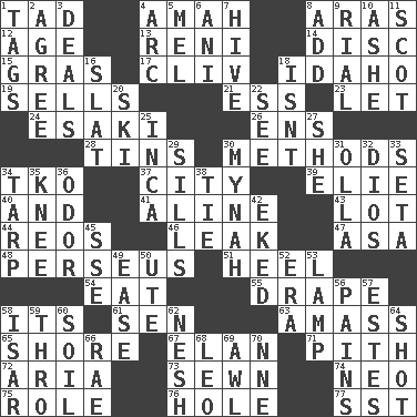 ACROSS 1. Bit 4. Housemaid 8. Caspian sea tributary 12. Mature 13. Painter Guido (1575-1642) 14. Flat circle 15. Pate de foie ____ 17. 154 in Roman numerals 18. Potato state 19. Makes a sale 21. Curvy letter 23. Allow 24. 1973 Nobel Price Winner (Physics) Leo 26. Followers of ems 28. Airtight sealed metal containers 30. Modes 34. Ring climax 37. Municipality 39. Writer Wiesel 40. Also 41. Place in a line 43. Car dealer's back yard 44. Vintage cars 46. Path through which fluid escapes 47. White ___ sheet 48. Son of Zeus who helped slay Medusa 51. The bottom of a shoe or boot 54. Consume 55. Window treatment 58. ___ a Wonderful Life 61. Elected rep. 63. Collect or gather 65. Dinah or Pauly 67. Enthusiasm 71. Heart or essence 72. Operatic vocal solo 73. Stitched 74. Modern: prefix 75. Hero or heavy, e.g. 76. Hollow 77. Fast jet (abbr.) DOWN 1. Labels 2. Match 3. Allots cards 4. Curve 5. Cartoonist voice _ Blanc 6. Cuckoo 7. Hub of activity 8. Increase 9. Monetary unit of Yemen 10. American tennis player Robert 11. Native of Scotland 16. Narrow board 18. Is not 20. What Jean-Claude Killy likes to do 22. Observe 25. South American Indian 27. A female animal or person 29. Beverly of Met fame 30. Non-adult bird? 31. Water jar 32. "Vaya con ____" 33. Bristle 34. Canvas cover 35. Leg joint 36. Aroma 38. Standoff 42. Supplemented with great effort 45. Compass dir. 49. Relaxation 50. Shoshoni 52. Period 53. Desk light 56. Aches 57. _____ Park, CO 58. Austrian river, tributary to the Danube 59. Through, poetically 60. Earth 62. Tender 64. Guess 66. Actress Charlotte 68. Lion 69. Leather borer 70. Compass dir.
