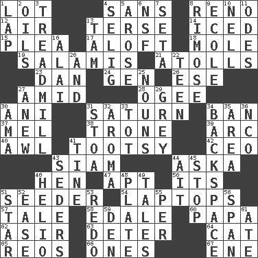 ACROSS 1. Car dealer's back yard 4. Without 8. Former U.S. Attorney General Janet 12. Atmosphere 13. Laconic 14. On the rocks 15. Entreaty 17. Upward 18. Undercover agent 19. Deli grouping 21. Ringlike coral islands and reefs 23. Daniel's nick name 24. Commissioned mil. rank 26. Compass dir. 27. Among 28. Double curve, resembling the letter S 30. Cuckoo 31. Titan orbits this 34. Forbid 37. Cartoonist voice _ Blanc 38. Marketplace scale 39. Curve 40. Leather borer 41. A girl or young woman (variant) 42. Corporate head (abbr.) 43. Thailand, formerly 44. "____ silly question..." 46. Layer 47. Fitting 50. It is 51. Sowing specialist 54. Portable computers 57. Lie 58. Peak District village in England 60. Dad 62. SW Saudi Arabia district 63. Prevent from occurring 64. Feline 65. Vintage cars 66. Singles 67. Compass dir. DOWN 1. Infant locale 2. Petroleums 3. Excercise machine 4. Major League Baseball Commissioner Bud 5. Came up 6. Overdraft (abbr.) 7. Stalk of a moss capsule 8. Full of chinks, cracks, or crevices 9. Learning spot: Fr. 10. 1994 drama film starring Jodie Foster 11. Lyric poems 13. Scottish cap 16. Jai _ 20. Plus 22. Adolescent 25. Parts of speech 27. Afresh 29. Jennifer or Joel 30. Nanny (var.) 31. Portico 32. Odor 33. Small child 34. Keyboard key 35. Length times width 36. Non-commissioned officer (abbr.) 41. Prong on a fork 43. Spring feasts 44. Small island 45. Close up, plug up 46. Sun: prefix 48. Food holder 49. Falsehoods 51. Play the lead 52. Relaxation 53. Make new 55. For each 56. Connect, as a bridge 59. Lair 61. Had dinner
