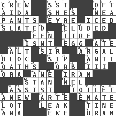 ACROSS 1. Ship's personnel 5. Fast jet (abbr.) 8. Often (poetically) 11. Opera by Verdi 12. "______ My Girl" (Turtles hit) 14. Teachers' org. 15. Leg coverings 17. Jane of fiction 18. On the rocks 19. Scheduled 21. Evaded 23. Car or cant ending 25. Hoop that covers a wheel 26. Is not 27. Oval reproductive body of a fowl 28. Had dinner 31. The first octave above the treble staff 33. Title for a knight 35. Therefore, facetiously 37. Coalition 38. Small drink 40. Opposed to 41. Profane or obscene expressions 43. Globe 45. One more than two 46. Mouth or opening 47. A saturated hydrocarbon 50. SW Asia republic 52. Comedian Laurel of Laurel & Hardy 53. Cartoonist voice _ Blanc 54. Help 56. Rest room 61. Afresh 62. Johnson of "Laugh-In" 65. Maternal 66. Car dealer's back yard 67. Path through which fluid escapes 68. Prong on a fork 69. Santa ___, CA 70. She-sheep 71. Northwest Algerian city DOWN 1. Smile enhancers 2. Monetary unit of Yemen 3. Pulitzer Prize-winning author Ferber 4. Electrical Unit 5. Compass dir. 6. Like a shrinking violet 7. Cylindrical with tapered ends 8. Single time 9. Nourish 10. Small amount or degree 13. Former Milwaukee Brewers owner Bud 16. Observes 18. Binary compound 20. Habitations of wild animals 22. Capital and largest city of Mongolia 24. Nuclear Threat Initiatives 26. Hankering 28. Hindu god of fire 29. Jacques of French films 30. Biblical high priest 31. Having or resembling wings 32. Globular water bottle used in Asia 34. River (Sp.) 36. Precipitation 37. Sometimes accompanies a hiss 39. Demure 42. Suttee (variant) 44. Cy Young winner Saberhagen 48. Rhinal 49. Main course 51. _ vera 52. Compass dir. 54. Soon (poet.) 55. Stalk of a moss capsule 57. To the inside or interior of 58. Den 59. Inactive volcano in Sicily 60. Adolescent 61. Chicken ___ king 63. The 23rd letter of the Hebrew alphabet 64. Supplement with great effort