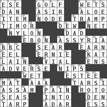 ACROSS 1. Compass dir. 4. _ course 8. Moistens 12. Daniel's nick name 13. SW Saudi Arabia district 14. _ vera 15. A whole individual unit 17. Connecting point 18. _____ steamer (cargo ship) 19. Southeast Indonesia island 21. Morning condensation 23. Fish or hair follower 24. High-strength synthetic material 26. June honoree 28. Inky black, to poets 30. Nineveh was its capital 34. English channel? 37. Wither 39. Merit 40. Snakelike fish 41. Bert's buddy 43. Krazy ___ of comics 44. (Had) reclined 46. Small bottle 47. Followers of ems 48. Contrary to your interests or welfare 51. Cuts off 54. Soggy 55. First name in cosmetics 58. Floor covering 61. Auto club (abbr.) 63. Tarsus (plural) 65. Indian state 67. Ache 71. Printing process, for short 72. Oceans 73. To the inside or interior of 74. Lair 75. Canvas cover 76. The sixth month of the Jewish calendar 77. Double-curved letter DOWN 1. Prepare for publication 2. Smooth fabric 3. Foe 4. Separate the seeds from cotton 5. Bear (Spanish) 6. Flaplike covering 7. Flintstone 8. Armed conflict 9. Liveliness 10. Heavy book 11. Back-to-school mo. 16. Undercover agent 18. It was, poetically 20. Director Reiner 22. Begley and Asner 25. Sense of smell 27. Color 29. Effrontery 30. Believer in; advocate of (suffix) 31. Libertine 32. SW Asia republic 33. Pismires 34. Actor Lugosi 35. Necklace unit 36. 154 in Roman numerals 38. Cuckoo 42. Writer Wiesel 45. ___ Haven, CT 49. 480, 500 or 516 sheets of paper 50. R.R. building 52. Pacific Standard Time (abbr.) 53. Play the lead 56. Wear away 57. _____ Park, CO 58. Vertical spar for supporting sails 59. At sea 60. Russian ruler of old 62. Capital of Western Samoa 64. Charged particles 66. Cleo's killer 68. Plus 69. Call ___ day 70. Or not