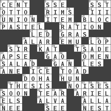 ACROSS 1. Penny 5. Compass dir. 8. Fast jet (abbr.) 11. Von Bismarck 12. Basketball hoops 14. One more than two 15. The state of being joined or united 17. A whole individual unit 18. Alliance 19. Soft color 21. Food allowance for one day 23. Directed 25. Pate de foie ____ 26. Having or resembling wings 27. Australian flightless bird 28. Trim (branches) 31. Title for a knight 33. Krazy ___ of comics 35. Sadhe (variant) 37. Domed church section 38. E Mali city 40. Sign of things to come 41. First course 43. Separate the seeds from cotton 45. French article 46. One (Scot) 47. Frozen water 50. Frog relative 52. Capital of the state of Qatar 53. Attila the _ 54. College paper 56. Annoying sounds 61. Within a short period 62. Lacerate 65. Satellite of Uranus 66. Raised railways 67. Inventor's middle name 68. Silent film actress Nazimova 69. Born 70. Observe 71. A home for chicks DOWN 1. Clever action or accomplishment 2. Inactive volcano in Sicily 3. Nuclear Threat Initiatives 4. A blast of a horn 5. Indian title of respect (Mr.) 6. Be seated 7. Develop 8. Grain storage tower 9. The Jewish people; Israel 10. Nervous spasm 13. Excessive but superficial compliments 16. 1994 drama film starring Jodie Foster 18. Again 20. Path through which fluid escapes 22. Drawn tight 24. To trail on the ground 26. Length times width 28. Unable to walk 29. Lyric poems 30. Writing instrument 31. Connect, as a bridge 32. Small island 34. Label 36. Exchanged or delivered for money 37. White ___ sheet 39. Pledge 42. "Vaya con ____" 44. Part of speech 48. Riviera of "Kiss of the Spider Woman" 49. Artist's stands 51. Small Philippine buffalo 52. Lair 54. Lacquered or enameled metalware 55. Flexible conduit 57. SW Asia republic 58. Filth; sediment 59. Snakelike fish 60. Narrow board 61. Elected rep. 63. "___ Maria" 64. Actress Charlotte