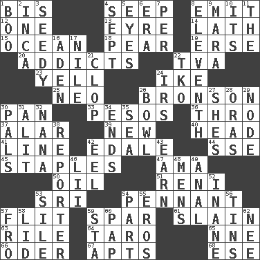 ACROSS 1. Again 4. Ooze 8. Give off 12. Single 13. Jane of fiction 14. Thin strip of wood or metal 15. Sea 18. Lightbulb-shaped fruit 19. Celtic language 20. Inveterate users 22. Federal power corp. 23. Shout 24. Mamie's husband 25. Modern: prefix 26. "Death Wish" actor 30. Baking dish 33. Mexican monetary units 36. Through, poetically 37. Having or resembling wings 39. ___ Haven, CT 40. Froth on beer 41. Actor's bit 42. Peak District village in England 44. Compass dir. 45. Paper fasteners 47. Nursemaid (var.) 50. Petroleum 51. Painter Guido (1575-1642) 53. _ Lanka 54. Pre-World Series prize 57. Secret move to avoid paying debts 59. Coast Guard woman 61. Killed 63. Cause heat under the collar 64. Pacific island yam 65. Compass dir. 66. Baltic tributary 67. Tenement units (abbr.) 68. Compass dir. DOWN 1. Sometimes accompanies a hiss 2. South American Indian 3. Morally degraded 4. Back-to-school mo. 5. Snake ____ (dice throw) 6. Period 7. For each 8. Veterans Day date 9. Hindu Mythology: god of death 10. ___ a Wonderful Life 11. Definite Article 16. Arabian gulf 17. The longest river in the world 21. Hoof sound 22. Ring climax 24. Big collection agency 26. Soup holder 27. "______ My Girl" (Turtles hit) 28. Mouths or openings 29. Thickened enlargement 30. Friends 31. Came down and settled, as after flight 32. Grandmother 34. Extremities 35. Ocean 38. News announcer 42. Snakelike fish 43. Merit 46. Cards in a Roman deck? 48. Not women's 49. Of or related to the anus 52. Lacking in sense or substance 53. Drop; flow; fall 54. Role in a play 55. Greek god of love 56. Canisters 57. Back 58. Flaplike covering 59. R.R. building 60. Infant food 62. Born