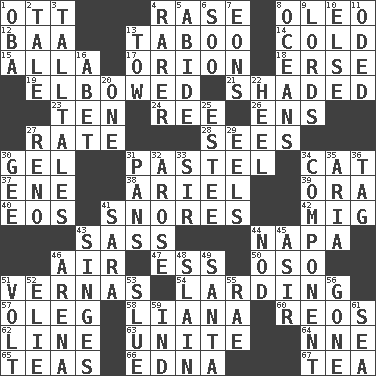 ACROSS 1. Baseball player Mel 4. Raze (variant) 8. Margarine 12. Sound made by sheep 13. Off limits 14. Lacking warmth 15. Silent film actress Nazimova 17. Constellation of myth 18. Celtic language 19. Turned at an angle; bent 21. Cast a shadow over 23. "___ Little Indians" 24. Portuguese money of account (variant) 26. Followers of ems 27. Pace 28. Observes 30. Set 31. Soft color 34. Feline 37. Compass dir. 38. Satellite of Uranus 39. Mouth or opening 40. Greek goddess of the dawn 41. Sounds asleep 42. Russian fighter aircraft 43. Backtalk 44. California wine valley 46. Atmosphere 47. Double-curved letter 50. Bear (Spanish) 51. Actresses Bloom and Felton 54. Preparing or cooking with lard 57. Cassini of fashion 58. Climbing, woody, usually tropical vines 60. Vintage cars 62. Actor's bit 63. Join together 64. Compass dir. 65. Afternoon social gatherings 66. Pulitzer Prize-winning author Ferber 67. Beverage made from leaves DOWN 1. Chief or king in Benin or Nigeria 2. Story 3. Baron Munchausen's specialties 4. More valued for its uncommonness 5. Remain 6. "Barney Miller" actor Jack 7. Immeasurably long periods of time 8. Seas 9. Titled peers of a realm 10. Otherwise 11. Wrote a lyric poem 13. Pull behind 16. Collude with 20. Single 22. Person who is morally reprehensible 25. First name in cosmetics 27. Western Nevada city 29. Snakelike fish 30. Turn to the right 31. Zero-star reviews 32. Came up 33. Title for a knight 34. Part 35. Roberta Peters solo 36. Label 41. "Two Mules for Sister ____" 43. Burns superficially 44. Dreamland 45. SW Saudi Arabia district 46. Sports stadium 48. Killed 49. Before Barbara or Clara 51. Electrical Unit 52. Writer Wiesel 53. Change direction abruptly 55. Actress Charlotte 56. Went 59. Indiana (abbr.) 61. Ocean