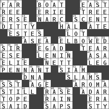 ACROSS 1. At a great distance 4. Water vessel 8. 90 degrees 12. Portuguese money of account (variant) 13. One of the Great Lakes 14. Relationship diagram 15. Celtic language 17. Drug cop 18. Aroma 19. Short, simple song 21. Actor Linden 23. Had dinner 24. _____ Park, CO 26. Car dealer's back yard 28. At sea 30. Turned at an angle; bent 34. Title for a knight 37. Mild oath 39. Pull apart 40. Compass dir. 41. Soviet premier 1918-24 43. White ___ sheet 44. Writer Wiesel 46. Remaining after all deductions 47. Part of a journey 48. Pre-World Series prize 51. Thailand, formerly 54. Heredity factor (abbr.) 55. Criticizes harshly 58. Fast jet (abbr.) 61. Personal question 63. Odor 65. Free from disturbance or agitation 67. To erase 71. The sixth month of the Jewish calendar 72. Drink excessively 73. Precipitation 74. Period 75. Expressed in words 76. Plant excrements 77. Filthy place DOWN 1. Flintstone 2. Nest on high 3. Musical pauses 4. Benjamin's nick name 5. Mouth or opening 6. Wind 7. Technician 8. And so on (abbr.) 9. Length times width 10. Transmitted 11. False hair 16. Singer James 18. Messy guy 20. Consenting reply 22. Everything 25. Stitch closed the eyes of (a falcon) 27. Small child 29. Rep 30. Proofreads 31. Welt 32. Relaxation 33. To trail on the ground 34. Ooze 35. Capri or Wight 36. It's straight from the horse's mouth 38. A saturated hydrocarbon 42. Nuclear Threat Initiatives 45. Conclude 49. Of or related to the anus 50. Tired old horse 52. Insect wing 53. Hindu Mythology: god of death 56. Methods 57. Don Adams' spy role 58. Fast planes 59. Portico 60. Native american tent (variation) 62. Blunders 64. Like ___ of sunshine 66. Directed 68. Auto club (abbr.) 69. Small drink 70. Followers of ems