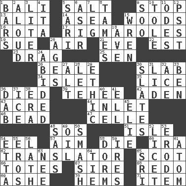 ACROSS 1. Indonesian resort city 5. Table seasoning 9. Cease 13. Came down and settled, as after flight 14. Toward the sea 15. Forest 16. Round or rotation of duties 17. Complicated, petty procedures 19. Institute legal proceedings 20. Atmosphere 21. First lady 22. Eastern Standard Time (abbr.) 23. To trail on the ground 25. Elected rep. 26. Calif. Air Force Base 30. Broad, flat, thick piece 34. Small island 35. Louse (plural) 36. Passed on 39. Giggle 42. An important port of Yemen 43. 43,560 square feet 44. An arm off of a larger body of water 46. Necklace unit 47. Cell (Danish) 48. Mayday 51. Small island 54. Snakelike fish 57. Direct toward a target or goal 58. Expire 60. Lyricist Gershwin 62. Interpreter 65. Native of Scotland 66. Hauls 67. Title for a man of rank and authority 68. Do over again 69. American tennis player Robert 70. Is hesitant and indecisive 71. A distinct part DOWN 1. Oblong pieces of solid material 2. Verbally 3. 61 cubic inches 4. Call ___ day 5. Indian skirt 6. SW Saudi Arabia district 7. Part of a journey 8. Softens 9. "Barney Miller" actor Jack 10. Lacquered or enameled metalware 11. Lyric poems 12. Inconspicuous attention getter 15. Songbird 18. "___ Maria" 20. Matures 24. Remained 27. Keyboard modifier key 28. Area sheltered from the wind 29. Moral principle 30. Chalkboards 31. Flaplike covering 32. Adept person 33. Benjamin's nick name 36. Pat or tap gently 37. Frozen water 38. Period 40. Compass dir. 41. Pipe bend 45. Writer Wiesel 48. Backtalk 49. Lubricate 50. Box-office sellout 52. It is permitted: Lat. 53. Eat (away) 54. Singer James 55. Greek god of love 56. Thin strip of wood or metal 58. Dormintory (informal) 59. Angers 61. Smallest unit of an element 63. Born 64. Neckwear 65. _ Lanka