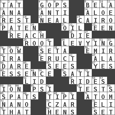 ACROSS 1. Make lace 4. Republicans 8. Actor Lugosi 12. Santa ___, CA 13. Against 14. Medicinal plant 15. Repose 17. Actress Patricia 18. Capital of Egypt 19. Eucharist need 21. Lubricate 23. Car or cant ending 24. Arrive at 26. Pass on 28. Carrot, for example 30. Imposing or collecting, as a tax 34. Pull behind 37. Bristle 39. Arab leader 40. Lyricist Gershwin 41. Spew [out] 43. Chicken ___ king 44. Have the gumption 46. Observes 47. Consenting reply 48. Gist 51. Suttee (variant) 54. Flaplike covering 55. Amusement-park features 58. Electrically charged atom 61. 23rd letter of the Greek alphabet 63. Trials 65. Arguments over trivial matters 67. Native american tent (variation) 71. Smallest unit of an element 72. Billionth: prefix 73. Russian ruler of old 74. Biblical high priest 75. Not this but _ 76. Coop moms 77. Put into a specified state DOWN 1. Canvas cover 2. Approach 3. Clothes sense 4. Separate the seeds from cotton 5. Single 6. Parent Teacher Assoc. 7. Grain storage tower 8. Sound made by sheep 9. Writer Wiesel 10. Old wives' tales, e.g. 11. Period of immesurable duration 16. Pull apart 18. 154 in Roman numerals 20. Non-commissioned officer (abbr.) 22. Binary compound 25. Flexible conduit 27. Sight organ 29. Laconic 30. Shoestrings 31. "If ____ say so..." 32. The longest river in the world 33. Pate de foie ____ 34. Event that recurs at intervals 35. Mouths or openings 36. Armed conflicts 38. Third day of the wk. 42. Russian ruler of old 45. Snakelike fish 49. Pinches, bites 50. Music discs 52. Teat (slang) 53. The content of cognition 56. _____ Park, CO 57. Fur scarf 58. Is not 59. Brightly colored fish 60. Nanny 62. Hankering 64. Stricken, poetically 66. Small child 68. Ending with capital 69. Baking dish 70. Big collection agency