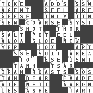 ACROSS 1. Puff or smoke 5. Sums up 9. Compass dir. 12. Rep 14. Stitch closed the eyes of (a falcon) 15. "We ___ not amused" (Victoria) 16. Honkers 17. Inwardly 18. Shallow baking pan 19. Elected rep. 20. Unrefined 23. System (abbr.) 24. Went for two points 25. Son of Odin 27. Table seasoning 30. Cooking vessel 32. Snakelike fish 33. Small Philippine buffalo 34. _ gin 36. ___ Haven, CT 38. Slangy assent 39. Brine-cured salmon 40. Fitting 43. Compass dir. 46. Set or collection 48. Type of rug 49. Small child 51. Compass dir. 52. Is not 53. Hyperbolic tangent 54. Russian ruler of old 56. SW Asia republic 58. Ridicules or criticizes harshly 61. Distress signal 64. Scottish cap 65. Letter starter 66. Dodge 68. Had dinner 69. Remaining after all deductions 70. Composer Copland 71. French article 72. American tennis player Robert 73. Small pie DOWN 1. Labels 2. Double curve, resembling the letter S 3. Peachy ____! 4. Followers of ems 5. SW Saudi Arabia district 6. Cub Scout units 7. Erase 8. Insidious 9. Letch 10. Indian titles of respect 11. Gone 13. Technology 21. I made a mistake 22. Ringlike coral islands and reefs 23. Flatfish 24. R.R. building 26. Layer 27. Declare 28. A saturated hydrocarbon 29. Chops off 31. Woman's close-fitting hat 35. Is 37. Armed conflicts 41. Animal enclosure 42. Make lace 44. Comedian Laurel of Laurel & Hardy 45. Age 47. Trial 48. Wind 50. Trios 53. Domesticates 55. Toward the sea 56. Slanted text style (abbr.) 57. Assign a rank or rating to 59. Pledge 60. Johnson of "Laugh-In" 61. "Two Mules for Sister ____" 62. Aroma 63. Emitted 65. Heredity factor (abbr.) 67. Large container