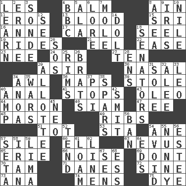 ACROSS 1. French article 4. Lip ointment 8. The 18th letter of the Arabic alphabet 11. Greek god of love 13. Vital fluid 15. Indian title of respect (Mr.) 16. Singer Murray 17. Monte _, Las Vegas Hotel/Casino 18. Sew up the eyelids of hawks and falcons 19. Amusement-park features 21. Snakelike fish 22. Relaxation 23. Born 24. Globe 27. Nine, plus one 29. SW Saudi Arabia district 30. Relating to the nose 34. Leather borer 36. Atlas contents 39. Fur scarf 40. Of or related to the anus 41. Discontinues 43. Margarine 44. Person of subnormal intelligence 46. Thailand, formerly 47. To sift 48. Thick mixture 49. Teases 51. Small child 53. R.R. building 54. One (Scot) 57. Drop; flow; fall 60. Pipe bend 63. Congenital growth or mark on the skin 65. One of the Great Lakes 66. Annoying sound 69. Do not 70. Scottish cap 71. Natives or inhabitants of Denmark 72. Trig term 73. Santa ___, CA 74. Not women's 75. Color DOWN 1. Acquire or gain knowledge or skills 2. Bert's buddy 3. Message 4. English channel? 5. Wing 6. Old wives' tales, e.g. 7. Undercover agent 8. At sea 9. Angers 10. Mediterranean tributary 12. Perceive with the eye 14. Dunce 18. Legislators 20. Mayday 25. Basketball hoops 26. Naughty children 28. Followers of ems 29. One to whom something is allotted 31. Not divided or shared with others 32. Toward shelter 33. Lion 34. Small Philippine buffalo 35. Armed conflicts 37. Luau course 38. Practice fights 40. Electrical Unit 42. Stricken, poetically 45. Modern: prefix 50. Forbid 52. Be inclined (to) 54. Stay clear from 55. Pet term 56. First name in cosmetics 57. Bristle 58. SW Asia republic 59. Pale green bean 61. Rich soil 62. Actor's bit 64. Begley and Asner 67. Elected rep. 68. Curvy letter