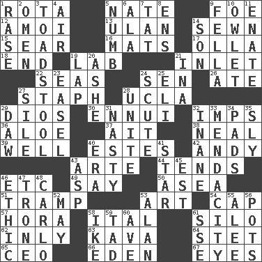 ACROSS 1. Round or rotation of duties 5. Nathan's nickname 9. Enemy 12. Mine, in Marseilles 13. ____ Bator 14. Stitched 15. Dry up 16. Floor protectors 17. Rounded earthenware pot or jar 18. Conclude 19. Experiment locale 21. An arm off of a larger body of water 22. Oceans 24. Elected rep. 26. Had dinner 27. Staphylococcus 28. Southern CA. univ. 29. "Vaya con ____" 30. World-weariness 32. Naughty children 36. Medicinal plant 37. Small island 38. Anneal 39. Not ill 40. _____ Park, CO 42. Actor Griffith 43. Johnson of "Laugh-In" 44. Is inclined (to) 46. And so on (abbr.) 49. Declare 50. Toward the sea 51. _____ steamer (cargo ship) 53. Nonscientific branch of learning 54. Head covering 57. Israeli folk dance 58. Slanted text style (abbr.) 61. Grain storage tower 62. In an inward manner 63. Polynesian shrub of the pepper family 64. Proofreading order 65. Corporate head (abbr.) 66. Genesis locale 67. Sight organs DOWN 1. To erase 2. Sign of things to come 3. Inedible or poisonous agaric 4. Wind 5. Unfeeling 6. In the manner of 7. Make lace 8. Followers of ems 9. Chap (slang) 10. A small or young owl 11. Related on the mother's side 14. Male child 19. Pet locale 20. American tennis player Robert 21. _ tizzy (2 wds.) 23. Artist's stand 24. Snake scale 25. Connecticut Ivy Leaguer 27. Filth; sediment 28. Join together 29. Simpleton 31. Difficult 32. Empty; void 33. Ananias' fault 34. Groovy apts. 35. Insidious 40. Epoch 41. Play the lead 43. Cleo's killer 45. Eastern Standard Time (abbr.) 46. Value system 47. Marketplace scale 48. Monte _, Las Vegas Hotel/Casino 52. Fifth month 53. Actor Alda or Thicke 55. Toward shelter 56. Cooking vessels 58. D.D.E's nickname 59. Bit 60. "___ Maria" 61. Compass dir.