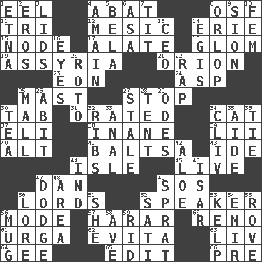 ACROSS 1. Snakelike fish 4. Blind as ____ 8. Order of Saint Francis (abbr.) 11. Three (prefix) 12. Mesonic 14. 4th largest of the Great Lakes 15. Connecting point 17. Having winglike extensions 18. Take by theft 19. Nineveh was its capital 21. Constellation of myth 23. Age 24. Viper 25. Vertical spar for supporting sails 27. Halt 30. Keyboard key 31. Declaimed 34. Domesticated feline 37. Connecticut Ivy Leaguer 38. Silly 39. Cards in a Roman deck? 40. The first octave above the treble staff 41. Greek mezzo-soprano Agnes 43. Binary compound 44. Small island 45. Moving, as bait 47. One of the 12 tribes of Israel 49. Mayday 50. Titled peers of a realm 52. Orator 56. Method 57. Ethiopian city, capital of Harari 60. San ____ (Riviera town) 61. Capital and largest city of Mongolia 62. Webber/Rice musical 63. 54 in ancient Rome 64. Unit of force equal to gravity 65. Prepare for publication 66. Before (prefix) DOWN 1. Inactive volcano in Sicily 2. Greek god of love 3. Flaplike coverings 4. At full speed 5. Actor Lugosi 6. White ___ sheet 7. Teat (slang) 8. Fourth or lowest deck 9. The Jewish people; Israel 10. Opposite of masc. 13. Corporate head (abbr.) 14. The front part of a cuirass 16. Sight organs 20. Printing process, for short 22. Hit sharply and swiftly 25. Promenade 26. "This won't hurt ____!" 27. Having lost freshness 28. Portable shelter 29. Lyric poems 30. Afternoon social gathering 32. Chest bones 33. Of or related to the anus 34. 154 in Roman numerals 35. Helper 36. Standoff 42. Medicinal plant 44. Indiana (abbr.) 46. Austrian river, tributary to the Danube 47. Evade 48. Type of rug 49. Small fatty European fish 50. Old wives' tales, e.g. 51. A female animal or person 52. Suttee (variant) 53. Seaweed 54. Arab leader 55. Be footloose 56. Java container 58. "___ Maria" 59. To free from