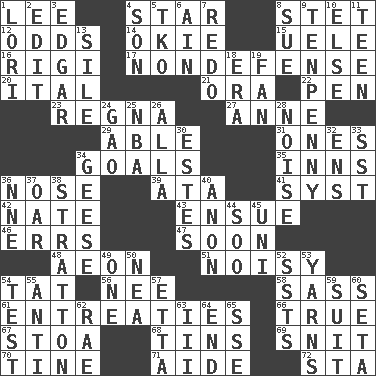 ACROSS 1. Area sheltered from the wind 4. Play the lead 8. Proofreading order 12. Likelihood 14. Migrant worker of the '30s 15. Ubangi River tributary 16. Swiss mountan, "Queen of the Mountains" 17. Unrelated to defense, as in spending 20. Slanted text style (abbr.) 21. Mouth or opening 22. Writing instrument 23. Canadian anthropologist Darnell 27. Queen of England 1702-14 29. Competent 31. Washington bills 34. Finish lines 35. Lodging establishments 36. Characteristic smell of wine 39. _ moment's notice (2 wds.) 41. System (abbr.) 42. Nathan's nickname 43. Take place subsequently 46. Blunders 47. Within a short period 48. A really long time 51. Annoyingly loud 54. Make lace 56. Born 58. Backtalk 61. Pleas 66. Loyal 67. Portico 68. Canisters 69. In a ____ (agitated or irritated) 70. Prong on a fork 71. Assistant 72. R.R. building DOWN 1. Australian parrot (variant) 2. Prepare for publication 3. _ Allan Poe 4. Manchild 5. Ring climax 6. The 18th letter of the Arabic alphabet 7. Do over again 8. Institute legal proceedings 9. 3-inch nail 10. Otherwise 11. Adolescent 13. Drop; flow; fall 18. Period 19. Air blower 24. E Mali city 25. Basketball assoc. 26. Silent film actress Nazimova 28. Annoying sound 30. _____ Park, CO 32. Followers of ems 33. Fast jet (abbr.) 34. Honkers 36. Compass dir. 37. Rowing implement 38. Ski resort town in Vermont 40. Soon (poet.) 44. "Barney Miller" actor Jack 45. University (slang) 49. Single 50. Teachers' org. 52. Fast planes 53. Tall tales 54. Trial 55. Against 57. Singer James 59. Costume for a special activity 60. Stalk of a moss capsule 62. Actress Charlotte 63. One more than two 64. Conclude 65. Compass dir.