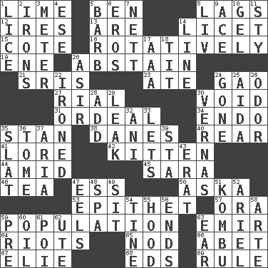 ACROSS 1. Welles in "The Third Man" 5. Benjamin's nick name 8. Falls behind 12. Angers 13. "We ___ not amused" (Victoria) 14. It is permitted: Lat. 15. ____ d'Azur (French Riviera) 16. Rotating or pertaining to rotation 19. Compass dir. 20. Refrain by choice 21. Indian titles of respect 23. Had dinner 24. E Mali city 27. Monetary unit of Yemen 30. Null 31. Severe or trying experience 34. Inside; within (prefix) 35. Comedian Laurel of Laurel & Hardy 38. Natives or inhabitants of Denmark 40. Stern 41. Old wives' tales, e.g. 42. Baby cat 44. Among 45. "Two Mules for Sister ____" 46. Beverage made from leaves 47. Curvy letter 50. "____ silly question..." 53. Curse 57. Mouth or opening 59. Census information 63. Arab leader 64. Debaucheries 65. Dreamland 66. Collude with 67. Writer Wiesel 68. Begley and Asner 69. Court order DOWN 1. Louse (plural) 2. Metal shackles 3. Distance measurement 4. Compass dir. 5. Sharp remark 6. Greek god of love 7. Remaining after all deductions 8. 54 in ancient Rome 9. Adept person 10. Set 11. Filthy place 14. Actor's bit 17. Auto club (abbr.) 18. Teat (slang) 20. SW Saudi Arabia district 22. Pressed 24. Went 25. Opera by Verdi 26. Aroma 28. Increase 29. Path through which fluid escapes 30. Actresses Bloom and Felton 32. Cuckoo 33. Allows 35. Narrow board 36. Heavy book 37. Operatic vocal solo 39. R.R. building 43. Part of Q.E.F. 47. Snakelike fish 48. Health resort 49. Be seated 51. Dried seaweed eaten as food 52. Satellite of Uranus 54. Prong on a fork 55. Parka part 56. Extremities 58. Johnson of "Laugh-In" 59. Before (prefix) 60. Lubricate 61. Luau course 62. Shoshoni 63. Ewer handle