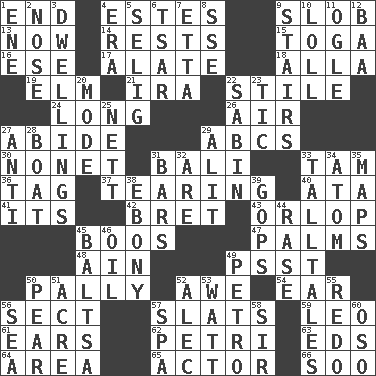ACROSS 1. Conclude 4. _____ Park, CO 9. Messy guy 13. Immediately 14. Musical pauses 15. Ancient Roman robe 16. Compass dir. 17. Having winglike extensions 18. Silent film actress Nazimova 19. Shade tree 21. Lyricist Gershwin 22. Vertical member of a panel or frame 24. Yearn 26. Wind 27. Stay 29. Lettered men learn these first 30. Music written for nine 31. Indonesian resort city 33. Scottish cap 36. Label 37. Separating forcefully 40. "One Day ___ Time" 41. It is 42. Cy Young winner Saberhagen 43. Fourth or lowest deck 45. Scornful sounds 47. Insides of hands 48. The 18th letter of the Arabic alphabet 49. Inconspicuous attention getter 50. Chummy 52. Deep reverence 54. Hearing organ 56. Religious group 57. Narrow boards 59. Lion 61. Hearing organs 62. _ dish (used to culture cells) 63. Begley and Asner 64. Length times width 65. Thespian 66. "Barney Miller" actor Jack DOWN 1. Compass dir. 2. Sense of smell 3. Residences 4. Epoch 5. Major League Baseball Commissioner Bud 6. Russian ruler of old 7. Singer James 8. Compass dir. 9. Flight of steps 10. Hang loosely or laxly 11. Stare 12. Sound made by sheep 20. Method 22. Unit of acoustic absorption 23. Nervous spasm 25. Remaining after all deductions 27. Against 28. Water vessel 29. Came down and settled, as after flight 31. Long, evenly shaped pieces 32. "We ___ not amused" (Victoria) 33. Baron Munchausen's specialties 34. Tiny particle 35. Atlas contents 38. Black 39. Republicans 44. Raze (variant) 45. Greek mezzo-soprano Agnes 46. Petroleum 49. Stone: prefix 50. Lightbulb-shaped fruit 51. Measure of real estate 52. Actor Baldwin 53. Electrical Unit 55. Do over again 56. Ocean 57. Health resort 58. Title for a knight 60. Bear (Spanish)