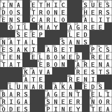 ACROSS 1. _ tizzy (2 wds.) 4. Value system 9. Institutes legal proceedings 13. Two (Sp.) 14. Marketplace scale 15. Possessive pronoun 16. Followers of ems 17. Monte _, Las Vegas Hotel/Casino 18. Set down 19. Petroleum 21. Fifth month 22. Match 24. Ooze 26. Directed 27. Relating to or accompanying birth 29. Without 30. 1973 Nobel Price Winner (Physics) Leo 31. Collude with 33. Personal Computers (abbr.) 36. "___ Little Indians" 37. Turned at an angle; bent 40. To separate or throw off 41. Make lace 42. Inky black, to poets 43. Sports stadium 45. Polynesian shrub of the pepper family 47. Musical pauses 48. Had dinner 49. Painter Guido (1575-1642) 50. Type of eclipse 52. Alias (abbr.) 54. Begley and Asner 56. Drinking establishments 57. Representative 59. Biblical high priest 61. Capital of Latvia 62. Contemptuous expression 63. Not either 64. Lyric poems 65. Abounding in pines 66. Afternoon social gathering DOWN 1. Binary compound 2. Words to Nanette 3. Helper 4. And so on (abbr.) 5. _____ steamer (cargo ship) 6. Israeli folk dance 7. Inwardly 8. Corporate head (abbr.) 9. Pottery fragments 10. Ubangi River tributary 11. One of the Great Lakes 12. Fast jet (abbr.) 20. Path through which fluid escapes 22. Having winglike extensions 23. Commissioned mil. rank 25. Writer Wiesel 27. Remaining after all deductions 28. At sea 29. Stitched 31. Swedish rock group 32. Sometimes accompanies a hiss 33. Elected leader of a country 34. Penny 35. Oceans 38. Crowbar 39. Have the gumption 44. French philosopher Descartes 45. Sunflower state 46. _ moment's notice (2 wds.) 49. The wife of a rajah (variant) 50. Put down 51. Goad 52. Hindu god of fire 53. Peachy ____! 55. A type of plum 56. Sis' sibling 57. Cleo's killer 58. Attempt 60. Lyricist Gershwin
