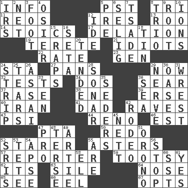 ACROSS 1. A message received and understood 5. Pacific Standard Time (abbr.) 8. Three (prefix) 11. Vintage cars 12. Angers 13. Friend of Pooh 14. Unemotional ones 17. Accusation by an informer 19. Cigar-shaped 21. Foolish or stupid persons 22. Pace 23. Commissioned military rank (abbr.) 24. R.R. building 27. Baking dishes 29. Immediately 32. Trials 34. Two (Sp.) 36. Shrivel 37. Raze (variant) 38. Compass dir. 39. Celtic language 40. SW Asia republic 41. Male parent 42. All-night dance parties 43. 23rd letter of the Greek alphabet 44. Western Nevada city 46. Eastern Standard Time (abbr.) 47. Parent Teacher Assoc. 50. Do over again 52. A viewer who gazes fixedly 55. Michaelmas daisies 57. Newsperson 59. Tootsie (variant) 62. ___ a Wonderful Life 63. Drop; flow; fall 64. Sense of smell 65. Perceive with the eye 66. Snakelike fish 67. Chooses DOWN 1. Big collection agency 2. Fish or hair follower 3. 12 inches 4. Flexible twig of a willow tree 5. Before (prefix) 6. Major League Baseball Commissioner Bud 7. Sadhe (variant) 8. Musical group of three 9. Carrot, for example 10. Charged particles 12. Binary compound 15. Dice game 16. Stalk of a moss capsule 18. Metal container 20. Watched over 24. Long narrow piece of something 25. Pulls into pieces 26. Slender Brazilian palm 28. Underwater navigation system 29. Impudent aggressiveness 30. Fertile tracts in a desert 31. Obtain by seizing forcibly or violently 33. "___ Little Indians" 35. Spring feasts 36. Ocean 42. Cowboy competition 45. Remaining after all deductions 47. Adept person 48. Laconic 49. Nick name for Arthur 51. U. of Maine site 52. Indian titles of respect 53. Wig 54. Domed church section 55. "We ___ not amused" (Victoria) 56. Obstruct or block passage 58. Pipe bend 60. Fast jet (abbr.) 61. Affirmative reply