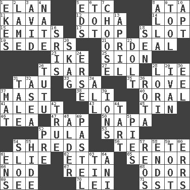 ACROSS 1. Liveliness 5. And so on (abbr.) 8. "One Day ___ Time" 11. Polynesian shrub of the pepper family 12. Capital of the state of Qatar 14. Trim (branches) 15. Sends forth 17. Discontinue 18. Position in a hierarchy or organization 19. Spring feasts 21. Severe or trying experience 23. Eisenhower's nickname 25. The Jewish people; Israel 26. Russian ruler of old 27. Pipe bend 28. Untruth 31. The 19th letter of the Greek alphabet 33. Girls' org. (abbr.) 35. Collection of objects 37. Vertical spar for supporting sails 38. Connecticut Ivy Leaguer 40. Relating to the mouth 41. Eskimo relative 43. Car dealer's back yard 45. Metal container 46. Beverage made from leaves 47. Reproach for some lapse or misdeed 50. California wine valley 52. Monetary unit of Botswana 53. _ Lanka 54. Fragments 56. Cigar-shaped 61. Writer Wiesel 62. Singer James 65. Sir (Sp.) 66. Lower and raise head in agreement 67. It's straight from the horse's mouth 68. Scent 69. Observe 70. Flowery wreath 71. Fast planes DOWN 1. Makes supply last 2. Unable to walk 3. Enthusiastic 4. Nathan's nickname 5. Begley and Asner 6. Small child 7. Opt 8. Silent film actress Nazimova 9. Utensil 10. Fitting 13. Showery time 16. Indian titles of respect 18. Elected rep. 20. Heroin 22. Stupid person 24. Celtic language 26. Ballerina skirt 28. Australian parrot (variant) 29. _ the terrible 30. Snakelike fish 31. Story 32. Toward the sea 34. Everything 36. Round or rotation of duties 37. Floor protector 39. Charged atoms 42. Loyal 44. Small pie 48. Tree or shrub in the Birch family 49. Soft color 51. Sliced desserts 52. Before (prefix) 54. A type of plum 55. Flintstone garb 57. Vintage cars 58. Extremities 59. A blast of a horn 60. Blunders 61. Followers of ems 63. Make a knot 64. Black tropical American cuckoo