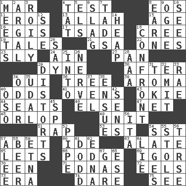 ACROSS 1. Spoil 4. Trial 8. Greek goddess of the dawn 11. Greek god of love 13. Assad's deity 15. Ripen 16. Armor plate that protects the chest 17. Sadhe (variant) 18. Algonquian 19. Stories 21. Girls' org. (abbr.) 22. Singles 23. Insidious 24. The 18th letter of the Arabic alphabet 27. Baking dish 29. Unit of force 30. Following 34. Fr. "Yes" 36. Family _ (genealogy) 39. Scent 40. Likelihood 41. Baking chambers 43. Migrant worker of the '30s 44. Theater features 46. Otherwise 47. Fish or hair follower 48. Lowest deck of a ship 49. A single undivided whole 51. Reproach for some lapse or misdeed 53. Eastern Standard Time (abbr.) 54. Fast jet (abbr.) 57. Collude with 60. Binary compound 63. Having winglike extensions 65. Allows 66. Plash 69. Composer Stravinsky 70. Car or cant ending 71. Ferber et al. 72. Snakelike fish 73. Period 74. Have the gumption 75. Observe DOWN 1. Confronts 2. Therefore, facetiously 3. Turbulent 4. Make lace 5. Raised railways 6. Volcanic refuse 7. Small amounts or degrees 8. Merit 9. Double curve, resembling the letter S 10. Perceives with the eye 12. Compass dir. 14. Pile 18. Meet 20. Declare 25. To the inside or interior of 26. Effrontery 28. Auto club (abbr.) 29. What propaganda does 31. Puff or smoke 32. Send forth 33. Actress Charlotte 34. Baltic tributary 35. Allodial 37. Snakelike fish 38. Follow as a consequence or result 40. Bear (Spanish) 42. Elected reps. 45. Health resort 50. Call ___ day 52. Corncob 54. Gurus 55. Took without asking 56. Laconic 57. Toward shelter 58. Fermented drink made from hops 59. Inactive volcano in Sicily 61. Texas town _ City 62. Pulitzer Prize-winning author Ferber 64. Untruth 67. Slender fish 68. Compass dir.