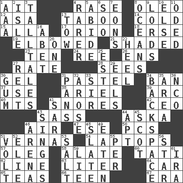 ACROSS 1. Small island 4. To erase 8. Margarine 12. White ___ sheet 13. Off limits 14. Lacking warmth 15. Silent film actress Nazimova 17. Greek mythologigal hunter 18. Celtic language 19. Shoved, as through a crowd 21. Cast a shadow over 23. "___ Little Indians" 24. To separate or throw off 26. Followers of ems 27. Assign a rank or rating to 28. Perceives with the eye 30. Set 31. Soft color 34. Prohibit 37. Purpose 38. Satellite of Uranus 39. Curve 40. Mountains (abbr.) 41. Sounds asleep 42. Corporate head (abbr.) 43. Backtalk 44. "____ silly question..." 46. Atmosphere 47. Compass dir. 50. Personal Computers (abbr.) 51. Actresses Bloom and Felton 54. Portable computers 57. Cassini of fashion 58. Having winglike extensions 60. Jacques of French films 62. Actor's bit 63. 61 cubic inches 64. 4-wheeled motor vehicle 65. Afternoon social gatherings 66. Adolescent 67. Period DOWN 1. Auto club (abbr.) 2. Capri or Wight 3. Baron Munchausen's specialties 4. Less widely known 5. Remain 6. "Barney Miller" actor Jack 7. Immeasurably long periods of time 8. Seas 9. Domineers 10. Otherwise 11. Wrote a lyric poem 13. Pull behind 16. Collude with 20. Single 22. Person who is morally reprehensible 25. First name in cosmetics 27. Remainder 29. Snakelike fish 30. Chewing product 31. Zero-star reviews 32. Came up 33. Title for a knight 34. Keyboard key 35. Type of rug 36. Non-commissioned officer (abbr.) 41. "Two Mules for Sister ____" 43. Burns superficially 44. Fitting 45. Native of Scotland 46. Sports stadium 48. Schedule 49. Eroded 51. Electrical Unit 52. Writer Wiesel 53. Table seasoning 55. For each 56. Play the lead 59. Falsehood 61. Lyricist Gershwin