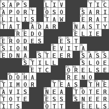 ACROSS 1. Plant excrements 5. 54 in ancient Rome 8. Nervous spasm 11. To the left, to Queeg 13. Bear (Spanish) 14. Indian skirt 15. Ms. Damita and namesakes 16. The 23rd letter of the Hebrew alphabet 17. Part of Q.E.F. 18. Make lace 19. The sixth month of the Jewish calendar 21. Difficult 22. Do over again 24. Writer Wiesel 25. Eats (away) 27. Eastern Standard Time (abbr.) 29. The Jewish people; Israel 30. Webber/Rice musical 32. Pulitzer Prize-winning author Ferber 33. Navigate 35. Backtalk 39. Free from disturbance or agitation 41. _ gin 42. And so on (abbr.) 43. Threatening words 45. Capital of the state of Qatar 48. Former U.S. Attorney General Janet 49. The easternmost of the Lesser Sundas 50. Beverages made from leaves 52. Definite Article 55. Opinion 56. Teachers' org. 57. Carrier 59. Carry 60. Curvy letter 61. Contemptuous expression 62. ___ a Wonderful Life 63. Baseball player Mel 64. Snakelike fish DOWN 1. Table seasoning 2. Capital of Western Samoa 3. Characterized by complete cowardliness 4. Indian title of respect (Mr.) 5. Globular water bottle used in Asia 6. Austrian river, tributary to the Danube 7. Promise 8. Tarsus (plural) 9. Feeling or showing extreme anger 10. Municipality 12. Sadhe (variant) 14. Lick closed 20. Two (Sp.) 21. Remaining after all deductions 23. Ferber et al. 25. Compass dir. 26. To free from 27. Night before a holiday 28. Title for a knight 30. Snakelike fish 31. NE Netherlands city 33. Be seated 34. Affectionate concern, for short 36. One to whom something is allotted 37. Distress signal 38. Observe 40. Rend 43. Mouth or opening 44. Musical pauses 45. A piece of turf (Scot.) 46. Leaves out 47. Flexible conduit 49. Jacques of French films 50. Trial 51. 90 degrees 53. The bottom of a shoe or boot 54. Blunders 56. Modern: prefix 58. Single
