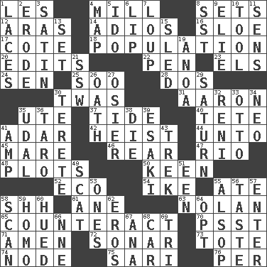 ACROSS 1. French article 4. Place where flour is made 8. Arranges properly for use 12. Caspian sea tributary 14. Goodbye (Sp.) 16. _ gin 17. ____ d'Azur (French Riviera) 18. Census information 20. Proofreads 22. Writing instrument 23. Raised railways 24. Elected rep. 25. "Barney Miller" actor Jack 28. Two (Sp.) 30. It was, poetically 31. Composer Copland 35. Shoshoni 37. Periodic rise and fall of the sea level 40. Wig 41. The sixth month of the Jewish calendar 42. Robbery 44. To (old English) 45. Female horse 46. Posterior 47. River (Sp.) 48. Graphs 50. Peachy ____! 52. Environmental prefix 54. Eisenhower's nickname 55. Had dinner 58. Quiet! 61. A saturated hydrocarbon 63. Pitcher Ryan 65. Frustrate 70. Inconspicuous attention getter 71. So be it 72. Echolocation 73. Haul 74. Thickened enlargement 75. Indian skirt 76. For each DOWN 1. Shoestrings 2. Eat (away) 3. Smooth fabric 4. Atlas unit 5. Wedding promise 6. Mouth edge 7. Central Nebraska county 8. Fast jet (abbr.) 9. Writer Wiesel 10. Utensil 11. Elected reps. 13. Put into a specified state 15. Downhill vehicle 19. Small Philippine buffalo 21. Compass dir. 26. Pledge 27. Flexible twig of a willow tree 29. Titan orbits this 30. Cylindrical with tapered ends 32. Painter Guido (1575-1642) 33. Von Bismarck 34. Modern: prefix 35. Allodial 36. Pacific island yam 38. Expire 39. 1973 Nobel Price Winner (Physics) Leo 41. Electrical Unit 43. Long journey 49. Scram! 51. Car or cant ending 53. Singles 55. Columnist Joseph or Stewart 56. Clothes sense 57. Keyboard key 58. Examine hastily 59. Like (prefix) 60. Took on color 62. Greek god of love 64. Elect 66. Compass dir. 67. Santa ___, CA 68. Automobile 69. Three (prefix)