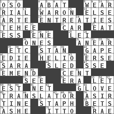 ACROSS 1. Bear (Spanish) 4. Blind as ____ 8. Erode 12. Monetary unit of Yemen 14. Make _____ (do battle with) 16. Otherwise 17. Johnson of "Laugh-In" 18. Pleas 20. Giggle 22. Auto 23. Ingest 24. Curvy letter 25. Compass dir. 28. Luau accessory 30. Singles 31. Approach 35. And so on (abbr.) 37. Comedian Laurel of Laurel & Hardy 40. Open wide 41. Singer Brickell 42. Sun: prefix 44. Celtic language 45. "Two Mules for Sister ____" 46. Downhill vehicle 47. Compass dir. 48. Make improvements or corrections to 50. Penny 52. Observe 54. Period 55. Allow 58. Eastern Standard Time (abbr.) 61. Fish or hair follower 63. Michael Jackson trademark 65. Interpreter 70. SW Saudi Arabia district 71. Prong on a fork 72. Staphylococcus 73. Wagers 74. American tennis player Robert 75. "Tell ____ the Marines!" 76. Actress Charlotte DOWN 1. Speak pompously 2. Founders of families 3. Curses 4. Deep reverence 5. Prohibit 6. Nonscientific branch of learning 7. Torque (variant) 8. Dripping 9. Writer Wiesel 10. Toward the sea 11. Take ten 13. Area sheltered from the wind 15. Actress Patricia 19. Length times width 21. Car or cant ending 26. Tender 27. _____ Park, CO 29. Consume 30. Seas 32. Hearing organs 33. Domed church section 34. Portuguese money of account (variant) 35. Dutch treat 36. Become fatigued 38. Everything 39. Sibling's daughter 41. Compass dir. 43. River in Europe 49. Cub Scout units 51. Tired old horse 53. Snakelike fish 55. Failure 56. Webber/Rice musical 57. Laconic 58. Singer James 59. Indian titles of respect 60. Hyperbolic tangent 62. Jacques of French films 64. Experiment locale 66. Born 67. Make lace 68. Choose 69. 17th letter of the Greek alphabet