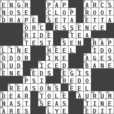 ACROSS 1. Engineer (abbr.) 5. Infant food 8. Arches 12. Characteristic smell of wine 13. Hoof sound 15. Carrot, for example 16. Window treatment 18. Stalk of a moss capsule 19. Singer James 20. The grampus (Milton) 22. Substance 24. Travel on or in a vehicle 26. Beverage made from leaves 27. Trial 28. Elected rep. 29. Reproach for some lapse or misdeed 32. Actor's bit 35. Person who is morally reprehensible 37. Wedding promise 38. Aroma 39. Mamie's mate 40. Eras 41. Partially opened flower 42. On the rocks 43. Object of repulsion 44. Compass dir. 45. Begley and Asner 46. Armor plate that protects the chest 49. Air pressure measure (abbr.) 50. Do over again 51. Thinks logically 55. Snakelike fish 56. Letter starter 57. Lacquered or enameled metalware 59. Gold (Symbol: Au) 63. Political cartoonist Thomas 64. Oceans 65. Prong on a fork 66. Ancient Greek god of war 67. Sodium hydroxide 68. Prepare for publication DOWN 1. Conclusion 2. Or not 3. Girls' org. (abbr.) 4. News announcer 5. Personal Computers (abbr.) 6. Toward shelter 7. Cooking vessels 8. Sports stadium 9. College mil. group 10. ____ d'Azur (French Riviera) 11. R.R. building 14. Soft color 17. One of the Great Lakes 21. Music discs 23. Car or cant ending 25. Moral principles 28. Sowing specialist 29. Capital of Latvia 30. An important port of Yemen 31. Airs 32. Ear part 33. Goddess of spring and wife of Bragi 34. Connecting point 36. Supplement with great effort 40. Utter; complete 42. Foolish or stupid persons 45. Double-curved letter 47. Turn to the right 48. The main thing one is thinking about 49. Pieces 51. Rump 52. Comfort 53. Christmas carol 54. Kill 56. Heredity factor (abbr.) 58. Compass dir. 60. To free from 61. Corn or form start 62. Was introduced to