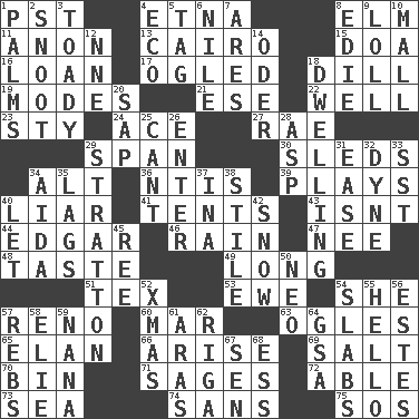 ACROSS 1. Pacific Standard Time (abbr.) 4. Inactive volcano in Sicily 8. Shade tree 11. At once, immediately (arch.) 13. Capital of Egypt 15. ___ good deed 16. Grant temporary use of 17. Stared at amorously 18. Deli pickle 19. Methods 21. Compass dir. 22. Not ill 23. Filthy place 24. Adept person 27. Actress Charlotte 29. Connect, as a bridge 30. Bobsleighs 34. The first octave above the treble staff 36. Nuclear Threat Initiatives 39. Frolics 40. One who doesn't tell the truth 41. Portable shelters 43. Is not 44. _ Allan Poe 46. Water falling in drops from the sky 47. Born 48. Clothes sense 49. Protracted 51. John Ritter's dad 53. She-sheep 54. A female animal or person 57. Former U.S. Attorney General Janet 60. Impair 63. Stares 65. Flair 66. Get up 69. Table seasoning 70. Storage container 71. Gurus 72. Competent 73. Ocean 74. Without 75. Distress signal DOWN 1. Insides of hands 2. Snout, nose 3. Sycophant 4. Environmental prefix 5. Label 6. "Death on the ____" 7. Ancient Greek god of war 8. Singer Brickell 9. Hang loosely or laxly 10. Promenade 12. Compass dir. 14. River in Europe 18. Residence 20. Plant excrement 25. Patter 26. Keyboard key 28. Viper 29. Ski resort town in Vermont 31. Relaxation 32. Centimeter-gram-second unit of force 33. Fast jet (abbr.) 34. Opera by Verdi 35. Fails to keep up a pace 37. _ tizzy (2 wds.) 38. Vertical member of a panel or frame 40. Allow 42. Frozen precipitation 45. Portuguese money of account (variant) 50. Modern: prefix 52. Dec. holiday 54. Thick slices 55. Phone greeting 56. _____ Park, CO 57. Confederate soldiers (slang) 58. Writer Wiesel 59. Grandmother 61. Caspian sea tributary 62. Capital of Latvia 64. Girls' org. (abbr.) 67. Elected rep. 68. Double-curved letter