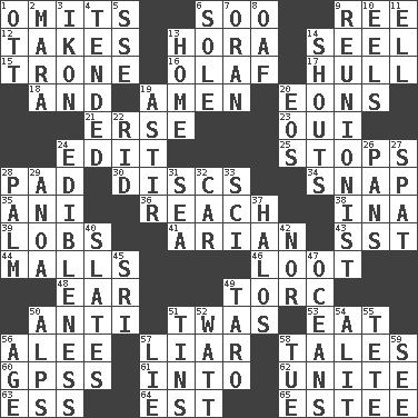 ACROSS 1. Leaves out 6. "Barney Miller" actor Jack 9. Portuguese money of account (variant) 12. Proceeds 13. Israeli folk dance 14. Sew up the eyelids of hawks and falcons 15. Marketplace scale 16. Norwegian king 17. Frame or body of a ship 18. Added to 19. So be it 20. Immeasurably long periods of time 21. Celtic language 23. Fr. "Yes" 24. Prepare for publication 25. Obstructs or blocks passage 28. Groovy apt. 30. Plates 34. Fastener 35. Cuckoo 36. Arrive at 38. _ tizzy (2 wds.) 39. Tennis shots 41. Believer in; advocate of (suffix) 43. Fast jet (abbr.) 44. Shopping centers 46. Plunder 48. Hearing organ 49. Torque (variant) 50. Opposed to 51. It was, poetically 53. Consume 56. Toward shelter 57. One who doesn't tell the truth 58. Lies 60. Global Positioning Systems (abbr.) 61. To the inside or interior of 62. Join together 63. Double-curved letter 64. Eastern Standard Time (abbr.) 65. First name in cosmetics DOWN 1. Baseball player Mel 2. Hindu Mythology: god of death 3. Visual representation of an object 4. Looked after 5. Compass dir. 6. Flatfish 7. NW Algerian seaport 8. Clumsy lout 9. One who advocates reunion 10. Snakelike fish 11. Pipe bend 13. Dwelling 14. Yells 19. Moving or stirring 20. Greek goddess of the dawn 22. To free from 24. The property of being fit to eat 26. Baking dishes 27. Petty quarrel 28. Inside of hand 29. Small Philippine buffalo 31. Ocean 32. Automobile 33. _-fi 37. Saint headwear 40. Chalkboards 42. Or not 45. Indian title of respect (Mr.) 47. Seas 49. Pacific island yam 50. High mountains 51. Airtight sealed metal containers 52. Electrical Unit 54. Set down 55. False hair 56. Ripen 57. Untruth 58. Third day of the wk. 59. Perceive with the eye
