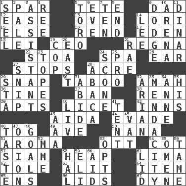 ACROSS 1. Practice fight 5. Wig 9. Male parent 12. Comfort 13. Baking chamber 14. Australian parrot (variant) 15. Otherwise 16. Tear apart 17. Locale of original sin 18. Flowery wreath 19. Corporate head (abbr.) 21. Rain (Swedish) 22. Portico 24. Health resort 26. Ewer handle 27. Obstructs or blocks passage 28. Measure of real estate 29. Fastener 30. Off limits 32. Nanny 36. Prong on a fork 37. Forbid 38. Painter Guido (1575-1642) 39. Tenement units (abbr.) 40. It is permitted: Lat. 42. Lodging establishments 43. Opera by Verdi 44. Dodge 46. Coat; cloak 49. "___ Maria" 50. Grandmother 51. Odor 53. Baseball player Mel 54. Small bed 57. Thailand, formerly 58. Pile 61. Pale green bean 62. Lacquered or enameled metalware 63. Set down 64. A whole individual unit 65. Followers of ems 66. Hats (slang) 67. Unit of force DOWN 1. Stitch closed the eyes of (a falcon) 2. Diluted with white 3. Aide 4. To sift 5. "Corrida" creature 6. First lady 7. "___ Little Indians" 8. Conclusion 9. Evade 10. Sports stadium 11. Middle Eastern gold or silver currency 14. Area sheltered from the wind 19. Police officer (slang) 20. Compass direction 21. Actress Charlotte 23. Drinks excessively 24. Biscuitlike quick bread 25. Adept person 27. Clip 28. Phillipine bananalike plant 29. R.R. building 31. Tolerate 32. Believer in; advocate of (suffix) 33. Ananias' fault 34. Queen of England 1702-14 35. Part of HMS, perhaps 40. 54 in ancient Rome 41. Portable shelter 43. American Automobile Association (abbr.) 45. Large container 46. Clothes sense 47. Constellation of myth 48. Purposes of endeavors 52. Madame (abbr.) 53. Chooses 55. Sign of something about to happen 56. Docile 58. Actor Linden 59. Connecticut Ivy Leaguer 60. Assist 61. Flaplike covering