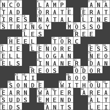 ACROSS 1. Non-commissioned officer (abbr.) 4. Desk light 8. Santa ___, CA 11. Small boy 12. Declaim 14. Part of Q.E.F. 15. Angers 17. Relating to or accompanying birth 18. Actor's bit 19. Slender, wiry 21. With motion or animation 23. French article 24. To riddle 25. The bottom of a shoe or boot 27. Torque (variant) 30. Falsehood 31. Poe poem 34. Curvy letter 37. Pipe bend 38. Utah city north of Ogden 39. Modern: prefix 40. Raised railways 41. More lacking in sense or substance 43. Daniel's nick name 44. Vintage cars 45. Scent 47. Cards in a Roman deck? 49. Oct. 31 cry 50. Something which is sent 52. Sans 56. Merit 57. Wetness 60. Type of rug 61. Beer foam 62. Make improvements or corrections to 63. The first octave above the treble staff 64. Begley and Asner 65. Pismires 66. Luau accessory DOWN 1. Nuclear Threat Initiatives 2. Heavy open wagon 3. River in Europe 4. Yearns 5. Like ___ of sunshine 6. Floor covering 7. Parent Teacher Assoc. 8. Ascend 9. Billionth: prefix 10. Had dinner 13. Shade tree 14. Otherwise 16. Drop; flow; fall 20. 1994 drama film starring Jodie Foster 22. The grampus (Milton) 25. Land elevation 26. Snakelike fish 27. Ancient Roman robes 28. NW Algerian seaport 29. French philosopher Descartes 30. Area sheltered from the wind 32. Writer Wiesel 33. Words to Nanette 34. Inside; within (prefix) 35. Shrivel 36. Male child 42. Carrot, for example 44. To free from 46. Capital of the state of Qatar 47. Nobles 48. Taverns 49. Avian creatures 50. Saudi Arabian king (1953-1964) 51. She-sheep 52. Left 53. Taken by mouth 54. Ubangi River tributary 55. Jacques of French films 56. Compass dir. 58. Wet nurse (var.) 59. "___ Little Indians"
