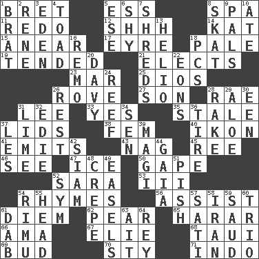 ACROSS 1. Cy Young winner Saberhagen 5. Curvy letter 8. Health resort 11. Redecorate 12. Quiet! 14. Krazy ___ of comics 15. Approach 17. Jane of fiction 18. Diluted with white 19. Looked after 21. Chooses 23. Make imperfect 25. "Vaya con ____" 26. Be footloose 27. Male offspring 28. Actress Charlotte 31. Area sheltered from the wind 33. Consenting reply 35. Having lost freshness 37. Hats (slang) 38. Opposite of masc. 40. Picture 41. Sends forth 43. Tired old horse 45. To sift 46. Observe 47. Frozen water 50. Open wide 52. "Two Mules for Sister ____" 53. One more than two 54. Poems 56. Help 61. South Vietnam president (1954) 62. Lightbulb-shaped fruit 65. Ethiopian city, capital of Harari 66. Wet nurse (var.) 67. Writer Wiesel 68. "Change" in Tahitian 69. Partially opened flower 70. Filthy place 71. Southeast Asian peninsula DOWN 1. Naughty child 2. French philosopher Descartes 3. Locale of original sin 4. Frog relative 5. Compass dir. 6. Like a shrinking violet 7. Tears up 8. Three-handed card game 9. Friends 10. Had dinner 13. Sun: prefix 16. San ____ (Riviera town) 18. Personal Computers (abbr.) 20. _ Jones' Locker 22. Immeasurably long periods of time 24. Coral collection 26. Take ten 28. Immoral or dissolute person 29. _ vera 30. Car or cant ending 31. Welles in "The Third Man" 32. Singer Brickell 34. Elected rep. 36. Become fatigued 37. French article 39. Wise men 42. Thailand, formerly 44. Greek goddess of the earth (variant) 48. Streamer paper 49. Artist's stands 51. Expression of disdain 52. Symbol (abbr.) 54. Tall New Zealand timber tree 55. Froth on beer 57. Suttee (variant) 58. SW Asia republic 59. Saudi Arabian king (1953-1964) 60. Musical group of three 61. Pat or tap gently 63. Small island 64. Marina Del _, California