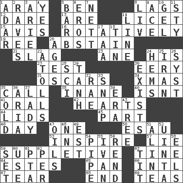 ACROSS 1. Like ___ of sunshine 5. Benjamin's nick name 8. Falls behind 12. Have the gumption 13. "We ___ not amused" (Victoria) 14. It is permitted: Lat. 15. Opinion 16. Rotating or pertaining to rotation 19. Portuguese money of account (variant) 20. Refrain by choice 21. Volcanic refuse 23. One (Scot) 24. Part of HMS, perhaps 27. Trial 30. Suggestive of the supernatural 31. Motion picture awards 34. Dec. holiday 35. Give a ring to 38. Empty; void 40. Is not 41. Taken by mouth 42. Centers of feelings and intuitions 44. Flaplike coverings 45. Piece 46. 24 hours 47. Single 50. He sold his birthright 53. Stimulate to action 57. Untruth 59. Supplying deficiencies 63. Prong on a fork 64. _____ Park, CO 65. Baking dish 66. International (abbr.) 67. Rend 68. Conclusion 69. Afternoon social gatherings DOWN 1. The sixth month of the Jewish calendar 2. All-night dance parties 3. Satellite of Uranus 4. It is so 5. Sharp remark 6. Greek god of love 7. Remaining after all deductions 8. 54 in ancient Rome 9. Adept person 10. Set 11. Filthy place 14. Actor's bit 17. Auto club (abbr.) 18. Shallow baking pan 20. Ripens 22. Ringlike coral islands and reefs 24. Equivocates 25. SW Asia republic 26. System (abbr.) 28. _-fi 29. Hyperbolic tangent 30. Is extant 32. Actress Charlotte 33. Fastener 35. Having a low temperature 36. Roberta Peters solo 37. Kenny Rogers chart-topper in '80 39. Epoch 43. Woody plant 47. Petroleums 48. Compass dir. 49. Eastern Standard Time (abbr.) 51. Place in a line 52. National forest in Provo, Utah 54. Corncob 55. _ the terrible 56. Tear apart 58. Snakelike fish 59. Put into a specified state 60. Purpose 61. Parent Teacher Assoc. 62. For each 63. Teat (slang)